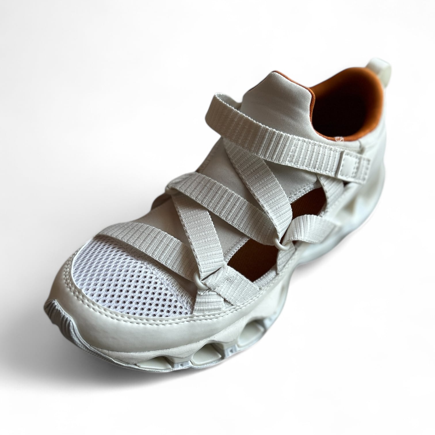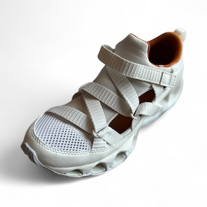 陸上のスプリントスパイク(短距離用スパイクシューズ)から着想を得て開発されたという一足。ワンアクションでフィット感をコントロールすることが出来る、ジグザグ状のベルクロストラップが特徴的。