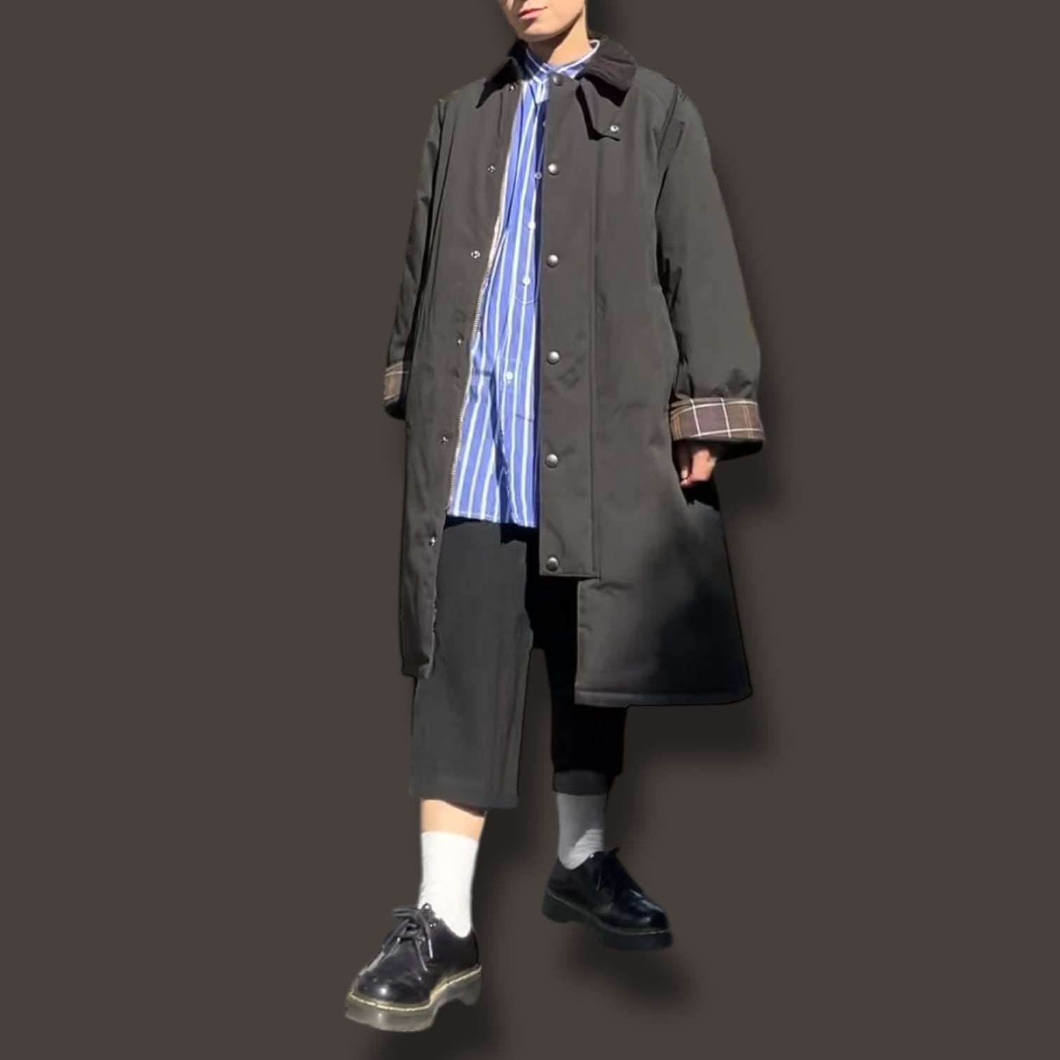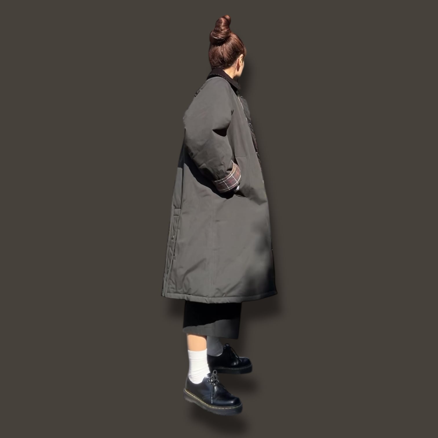 長さのあるコートでありながら、中綿が入ることで温かみ、柔らかさを全体に感じられる