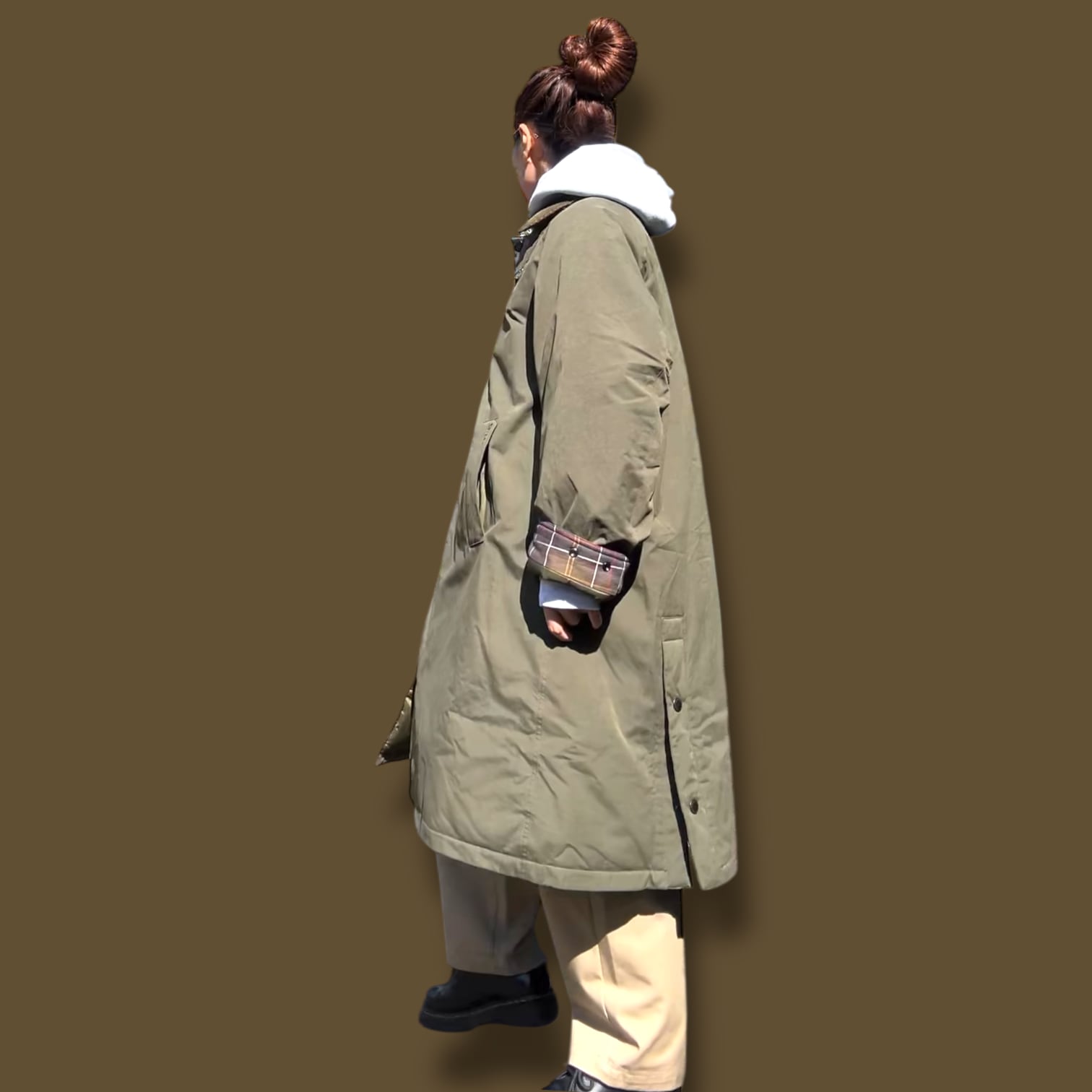 長さのあるコートでありながら、中綿が入ることで温かみ、柔らかさを全体に感じられる
