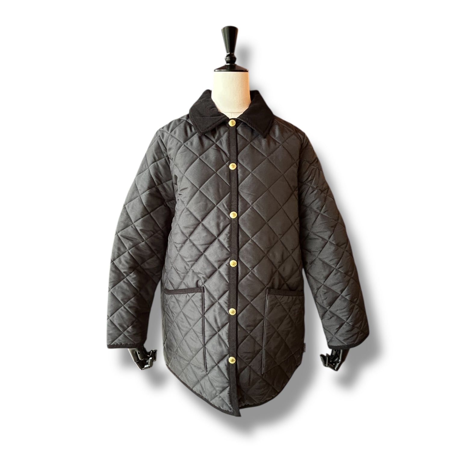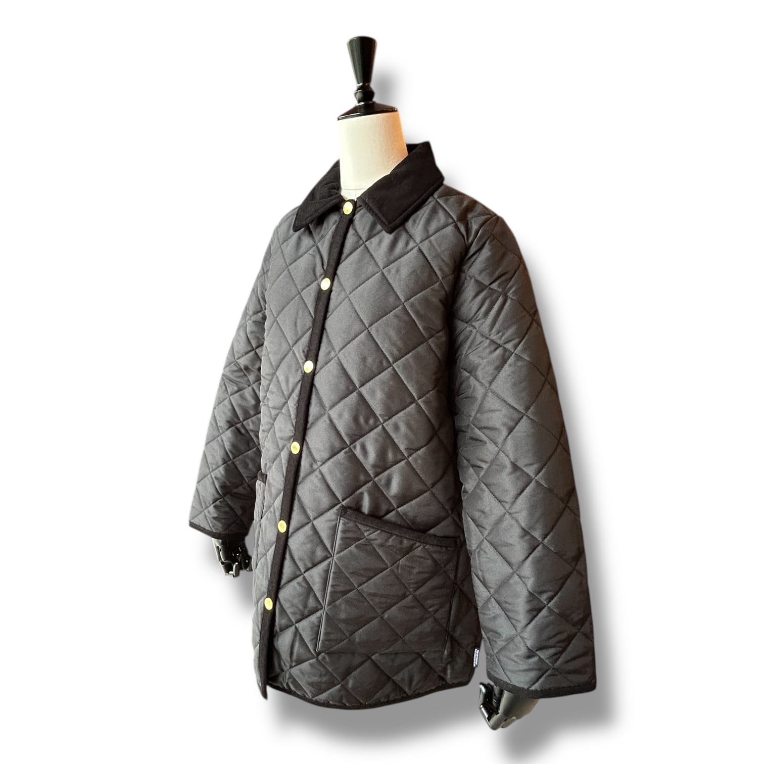 ファミリーブランドのマッキントッシュより伝わるキルティングジャケットを、肩のラインはすっきりしながらも、ゆったりシルエットに仕上げたAラインモデル。繊細なコーデュロイ襟、襟を立てて両襟を留めることのできるチンタブ、ゴールドのドットボタン等のクラシックなディテールが光ります。
