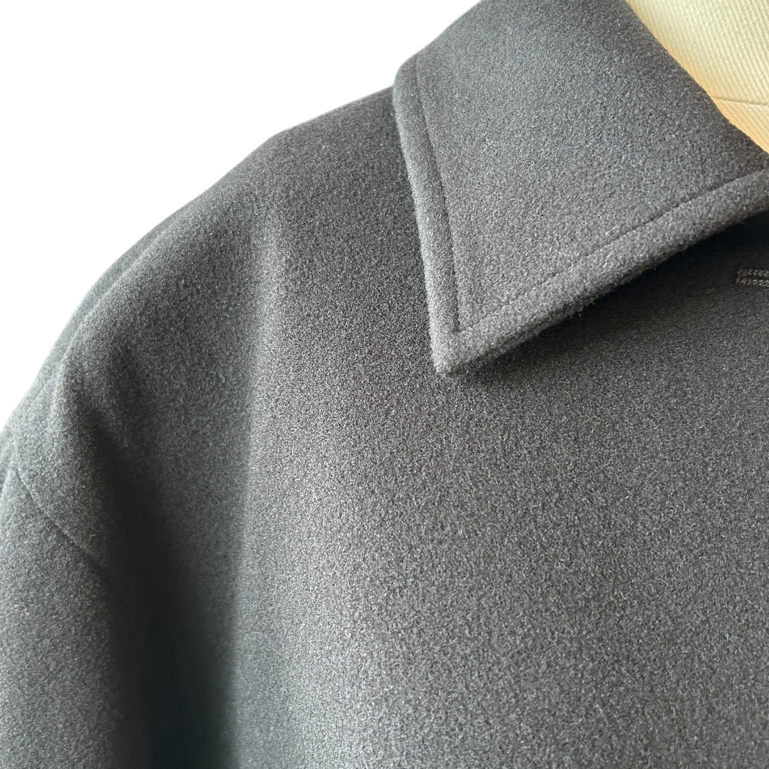 ハリと膨らみがあり、立体的なシルエットが際立ちます。フラップポケット付。襟を立ててチンタブで両襟を留めると、キリっとした印象に。