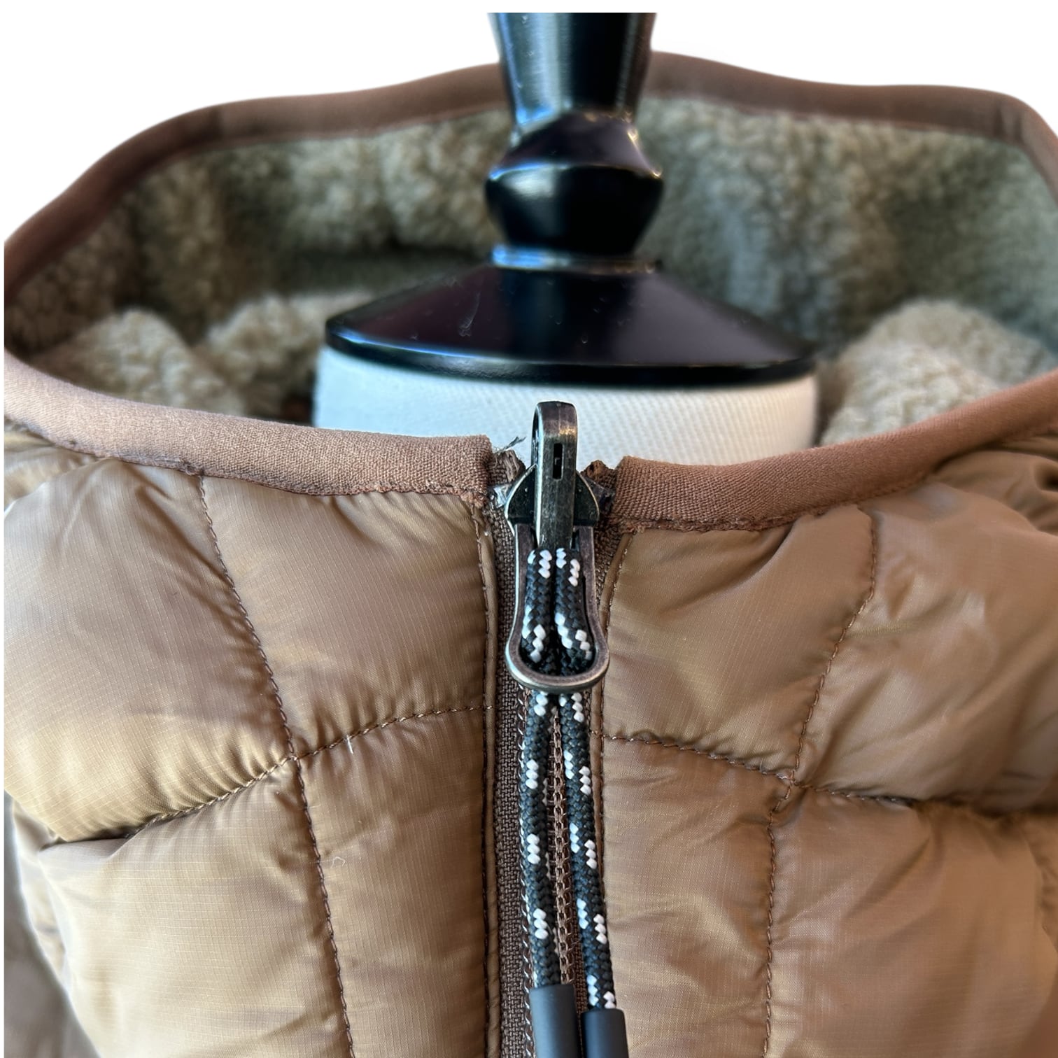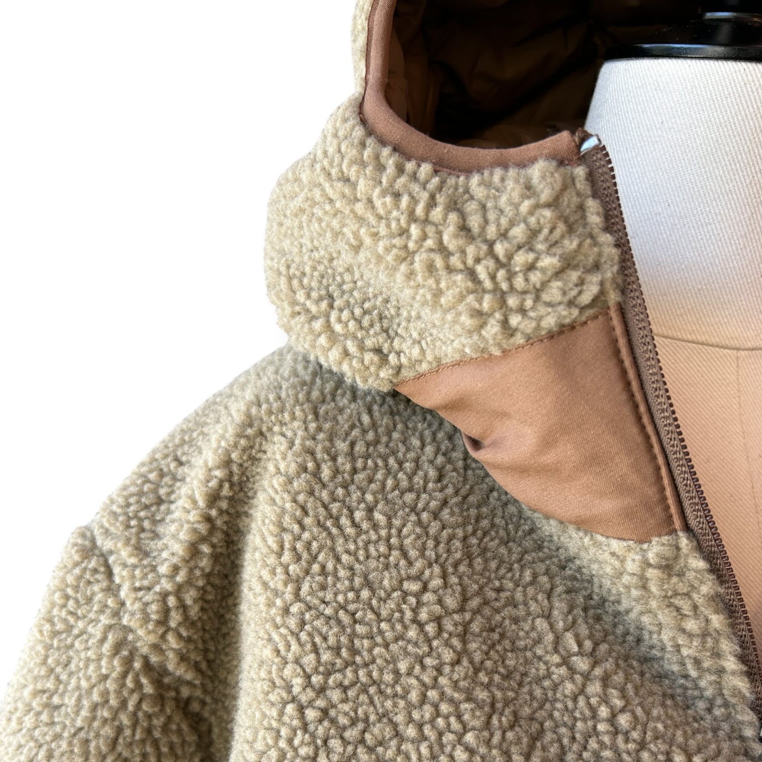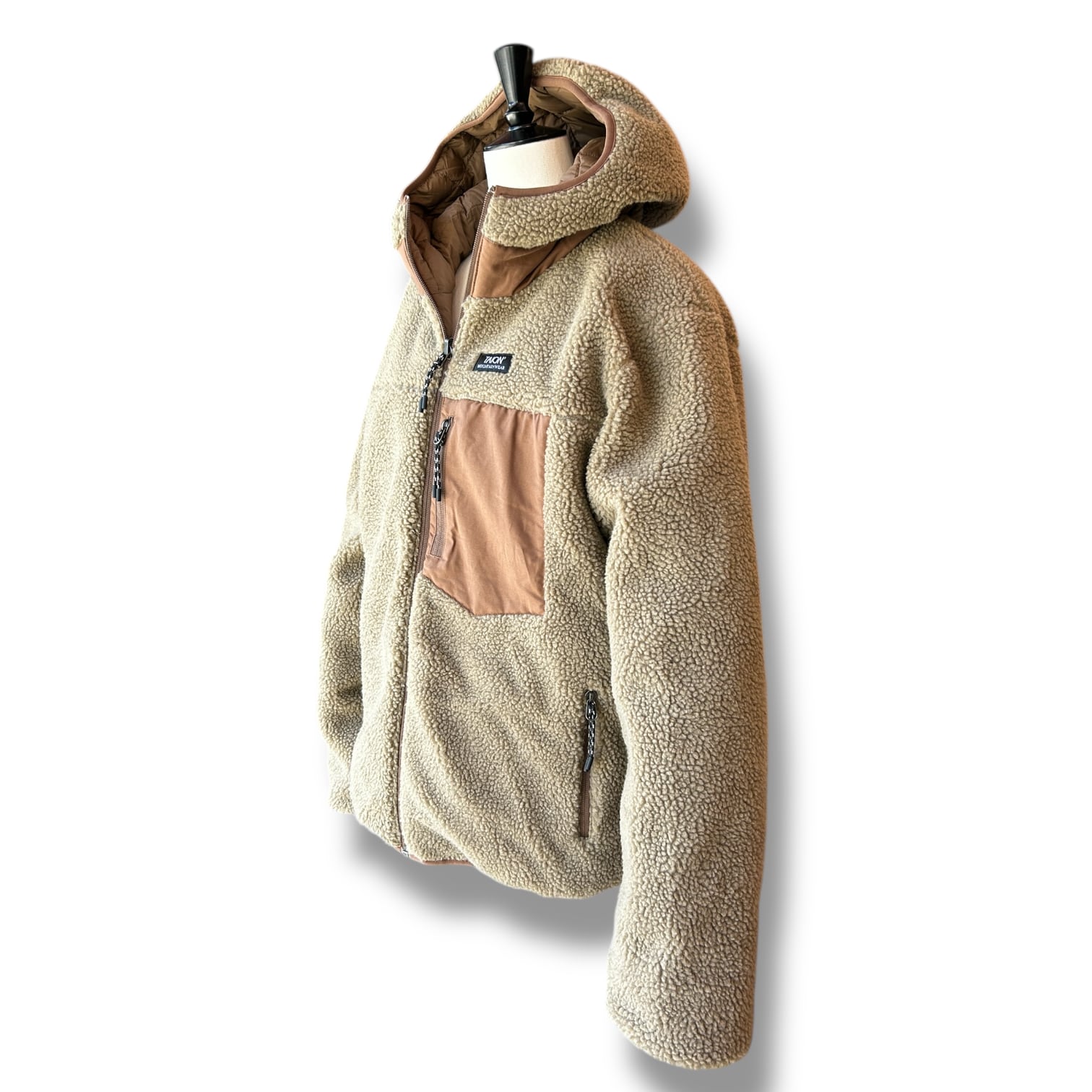 表側には、ナイロンリップストップ素材に保温性の高い800FPダウンを使用、裏側には、厚みのあるボア素材を組み合わせました。