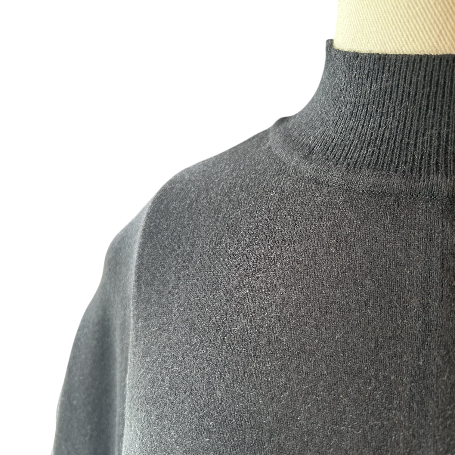 上半身で細い部分は細く、ネック部分もすっきりと折り返す必要のないモックネックになっていることから、気兼ねなくさっと手に取り着て頂けるほど着やすいデザインです。