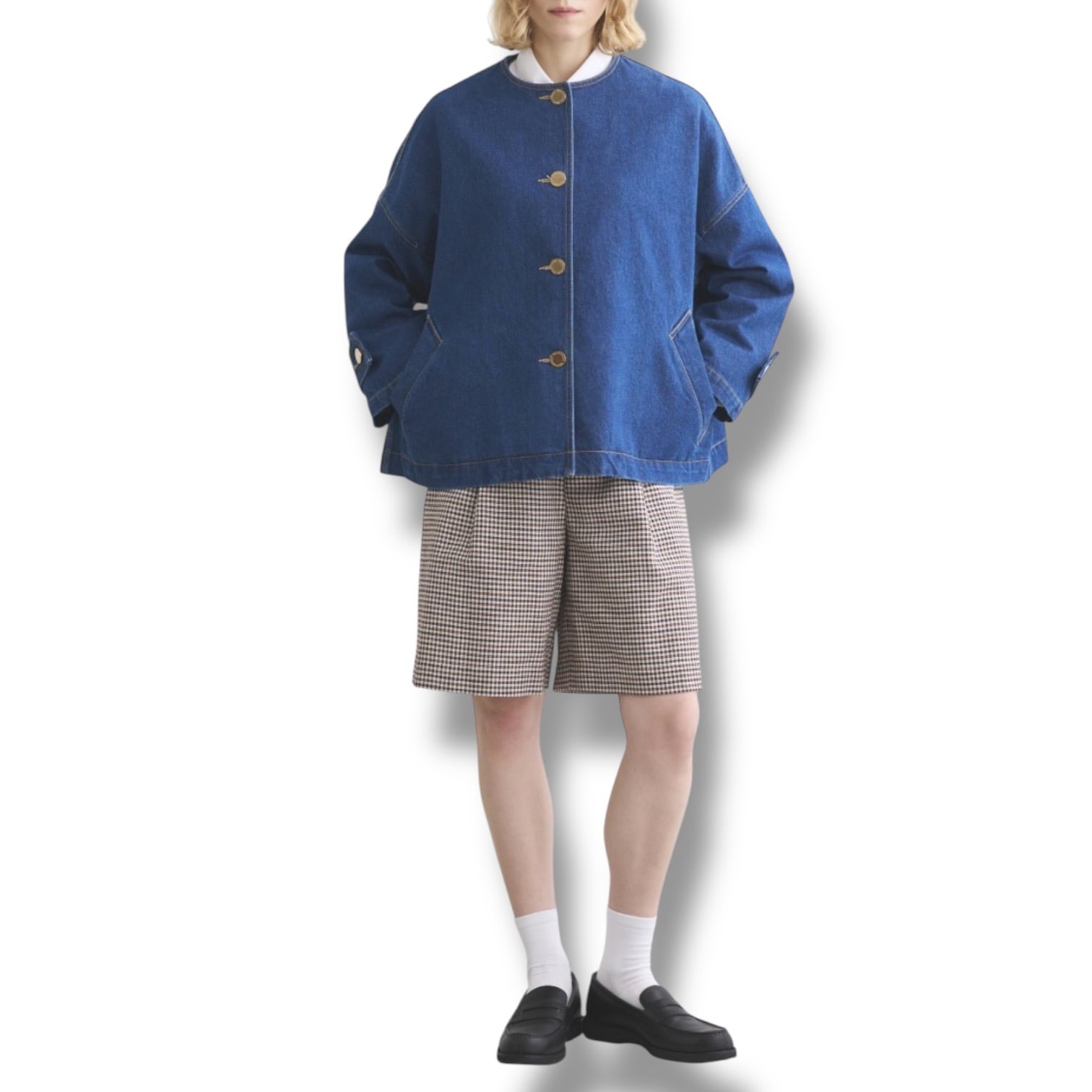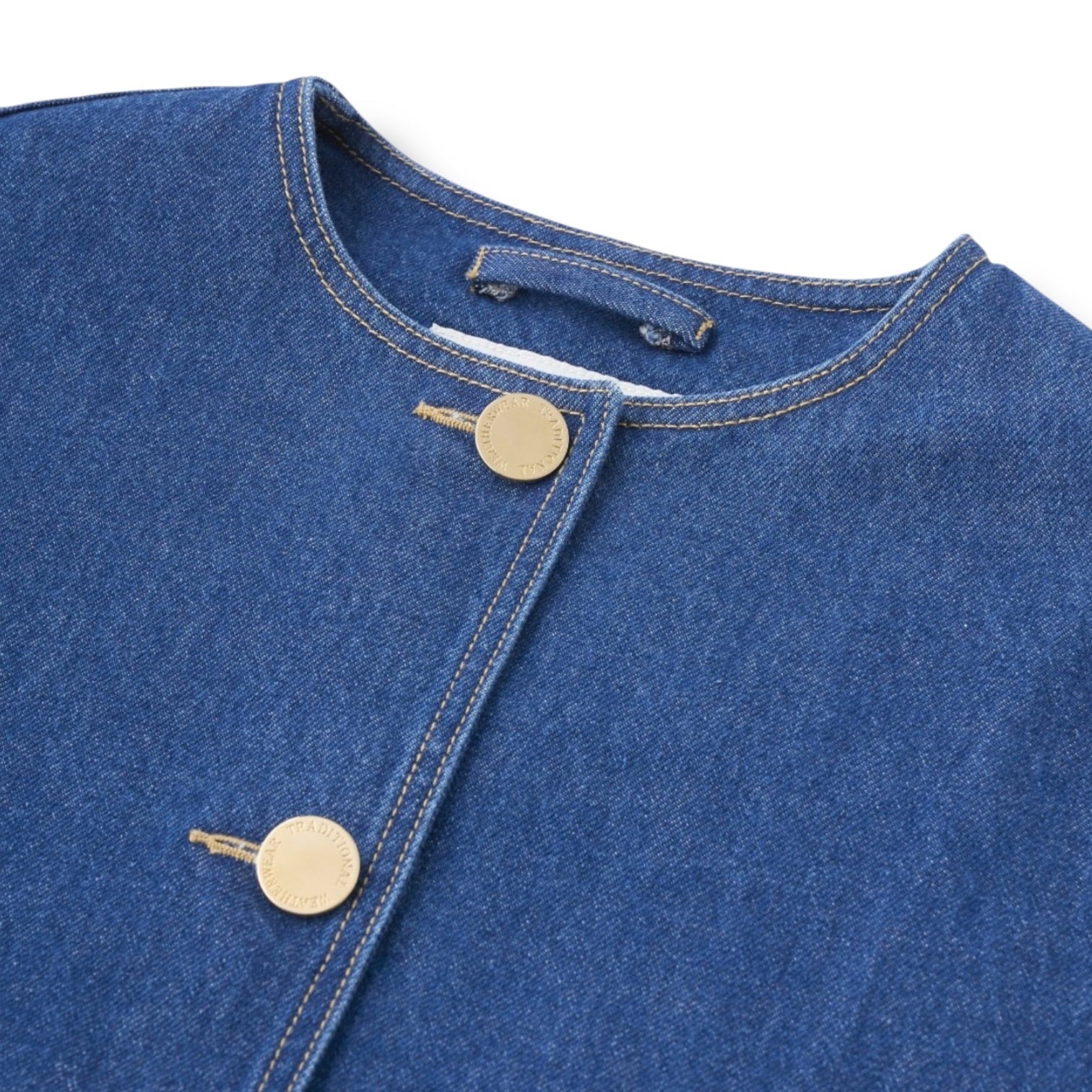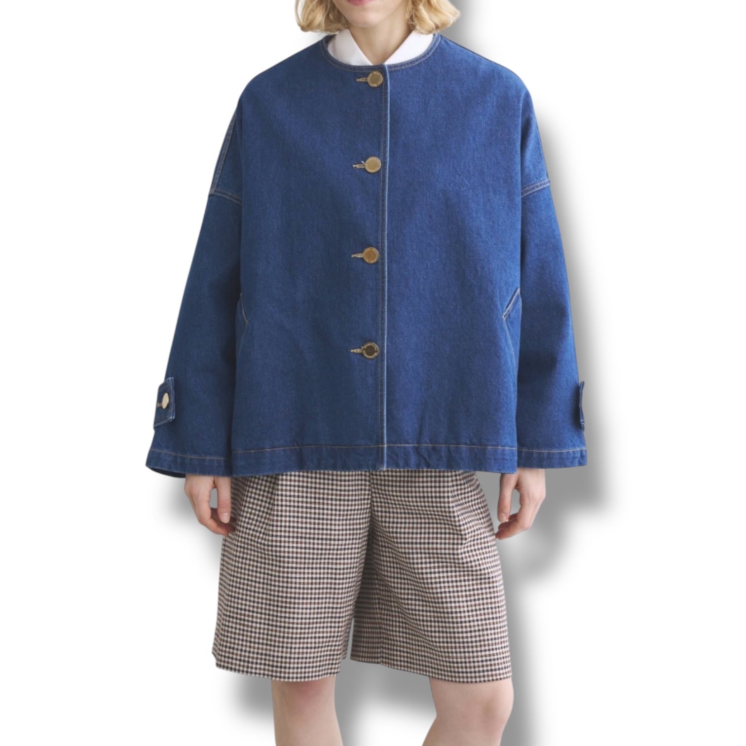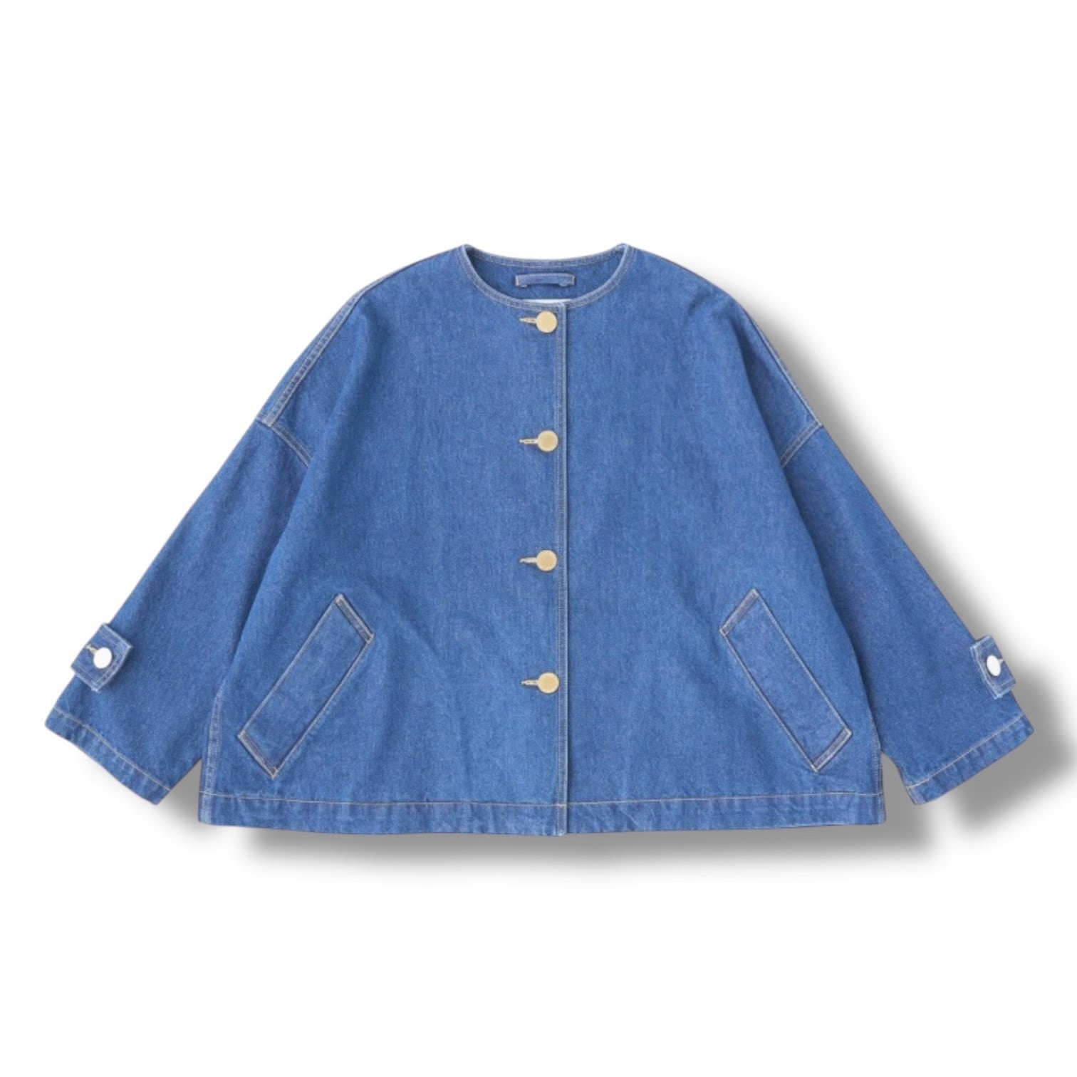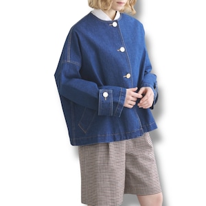 こちらのマールトン ノーカラー ショート デニムは、きちんと感がありながら、ゆったりとした優しいシルエットが魅力で、着る人を選ばない万能アイテムです。