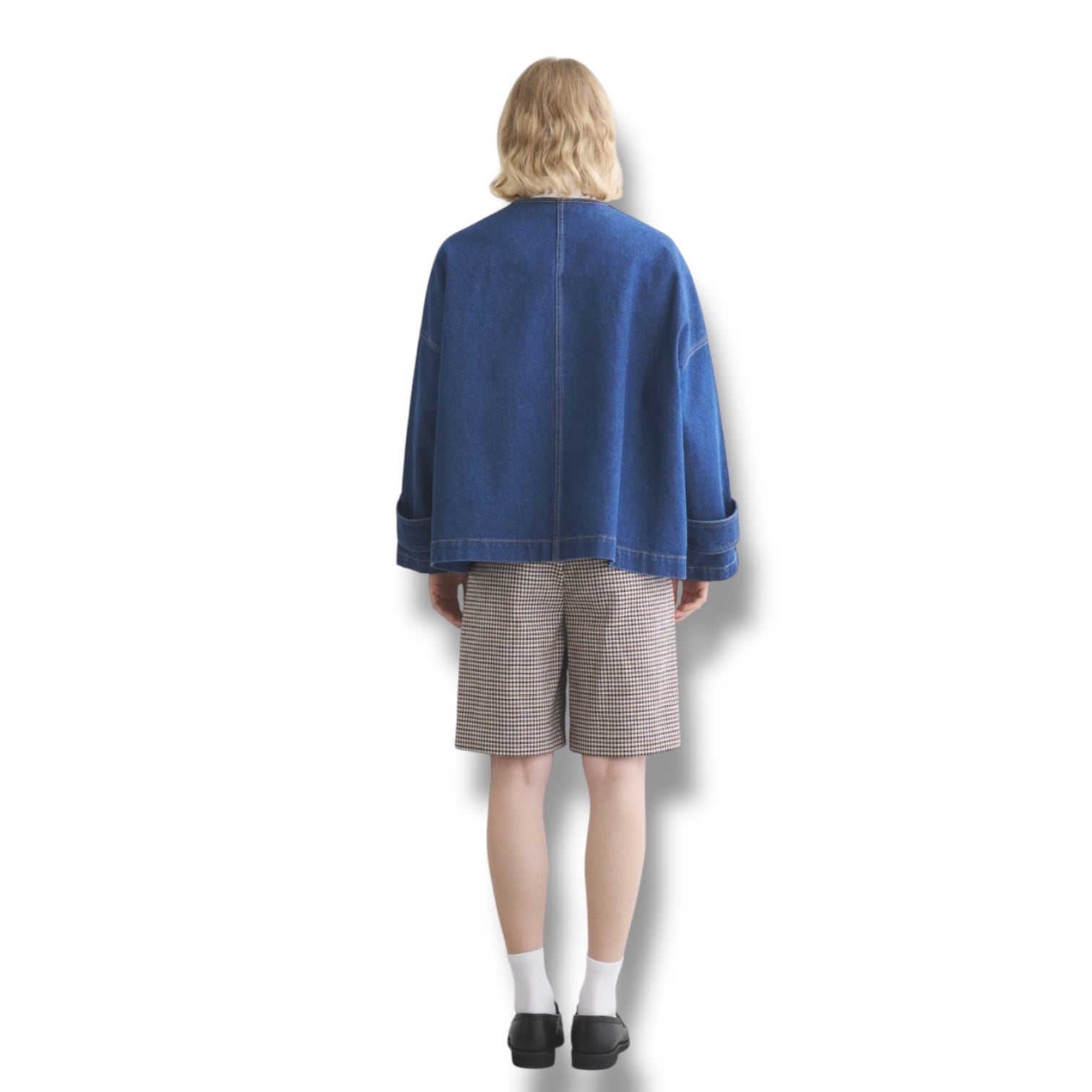 ドロップショルダーでオーバーサイズのコート、MALTON DENIM(マールトン デニム)のショート丈のノーカラーモデル。