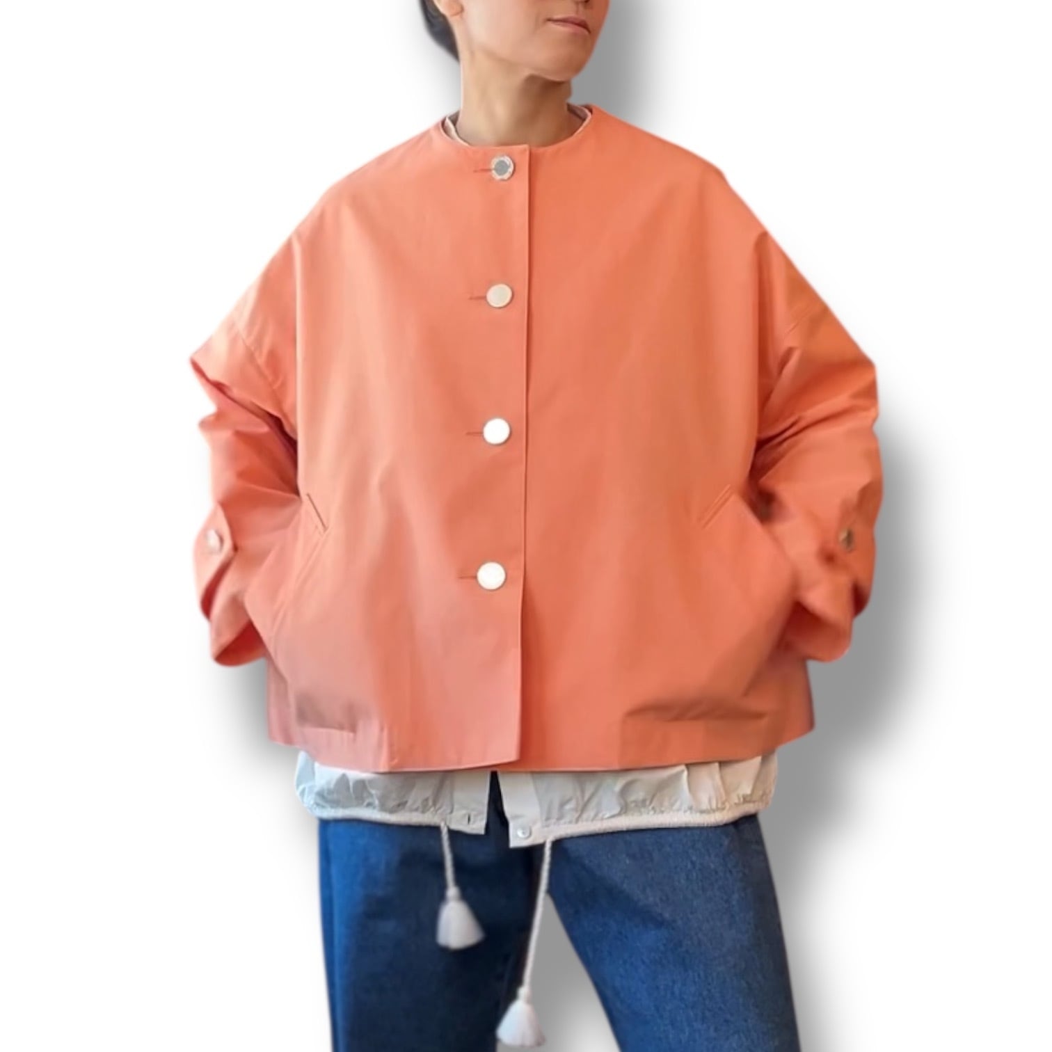 こちらのモデルは、ベストセラーのマールトンノーカラーの雰囲気はそのままに、着丈が25cm程短くなった軽やかなショートコートで、ジャケット代わりにも活躍し、カジュアルなデニムからフェミニンなスカートまで幅広いボトムスと相性が良い万能アイテムです。