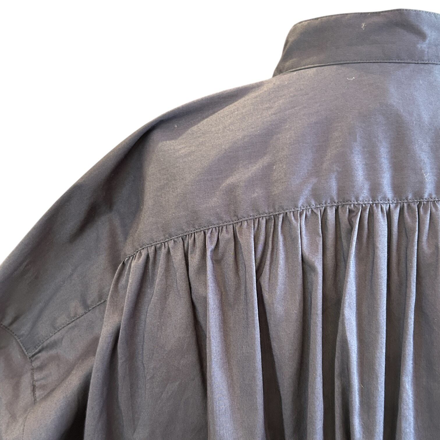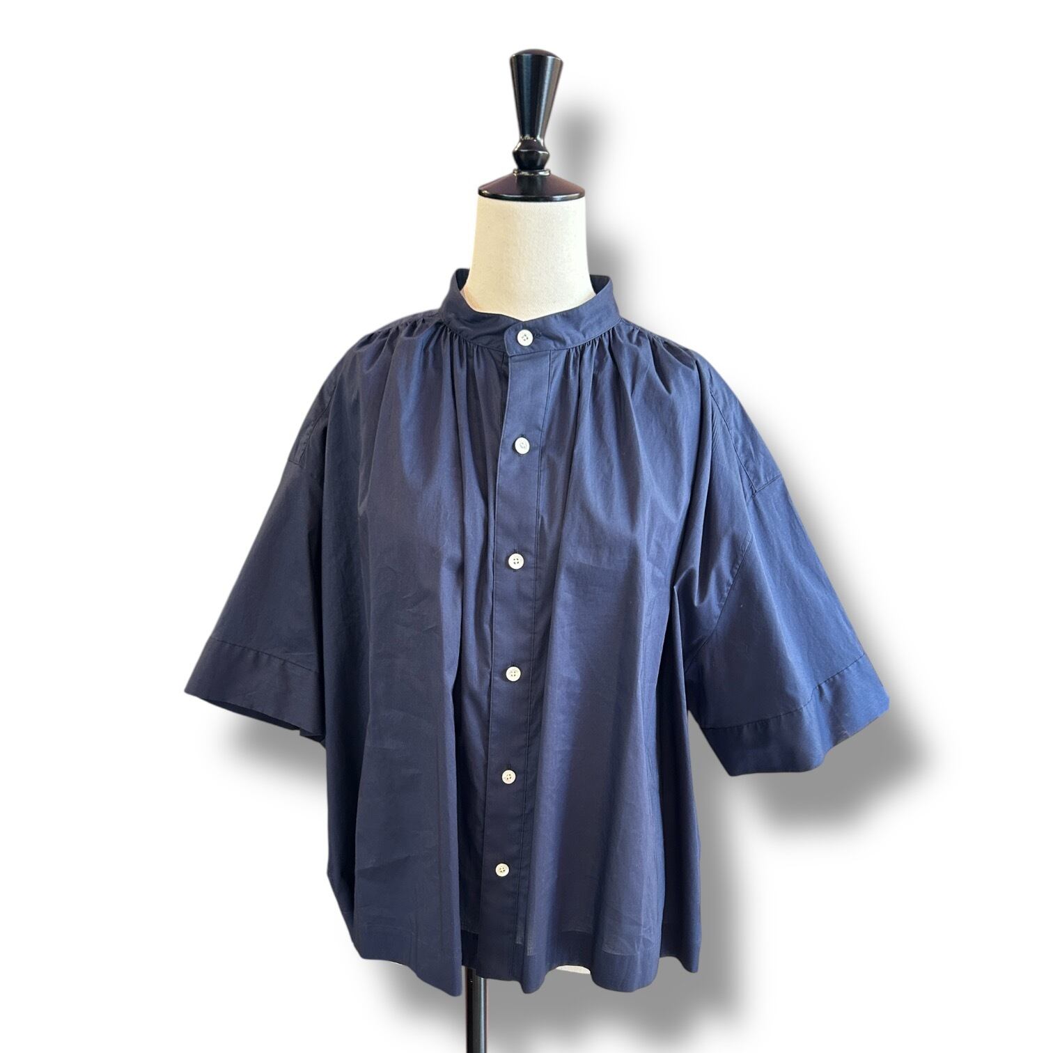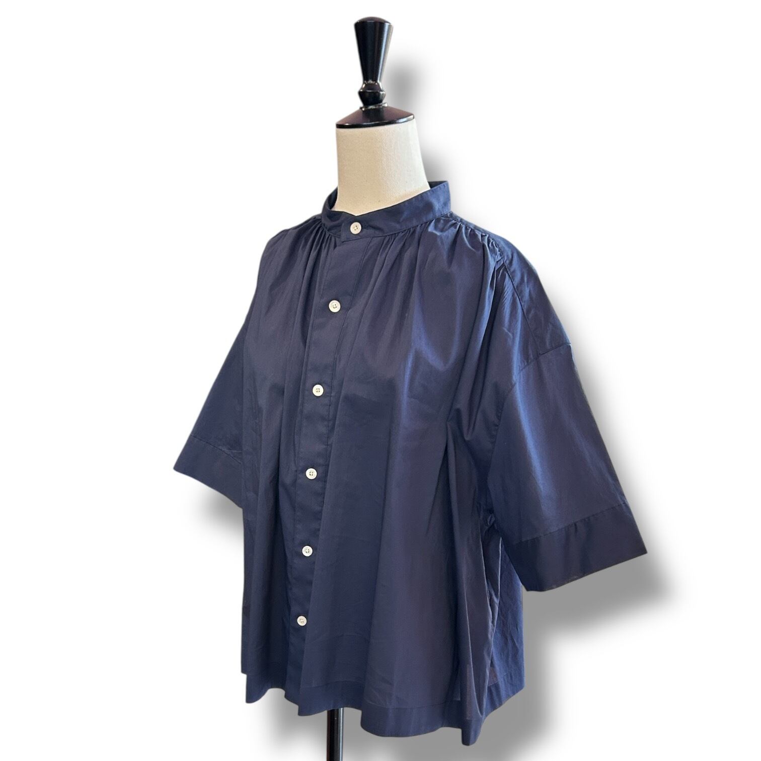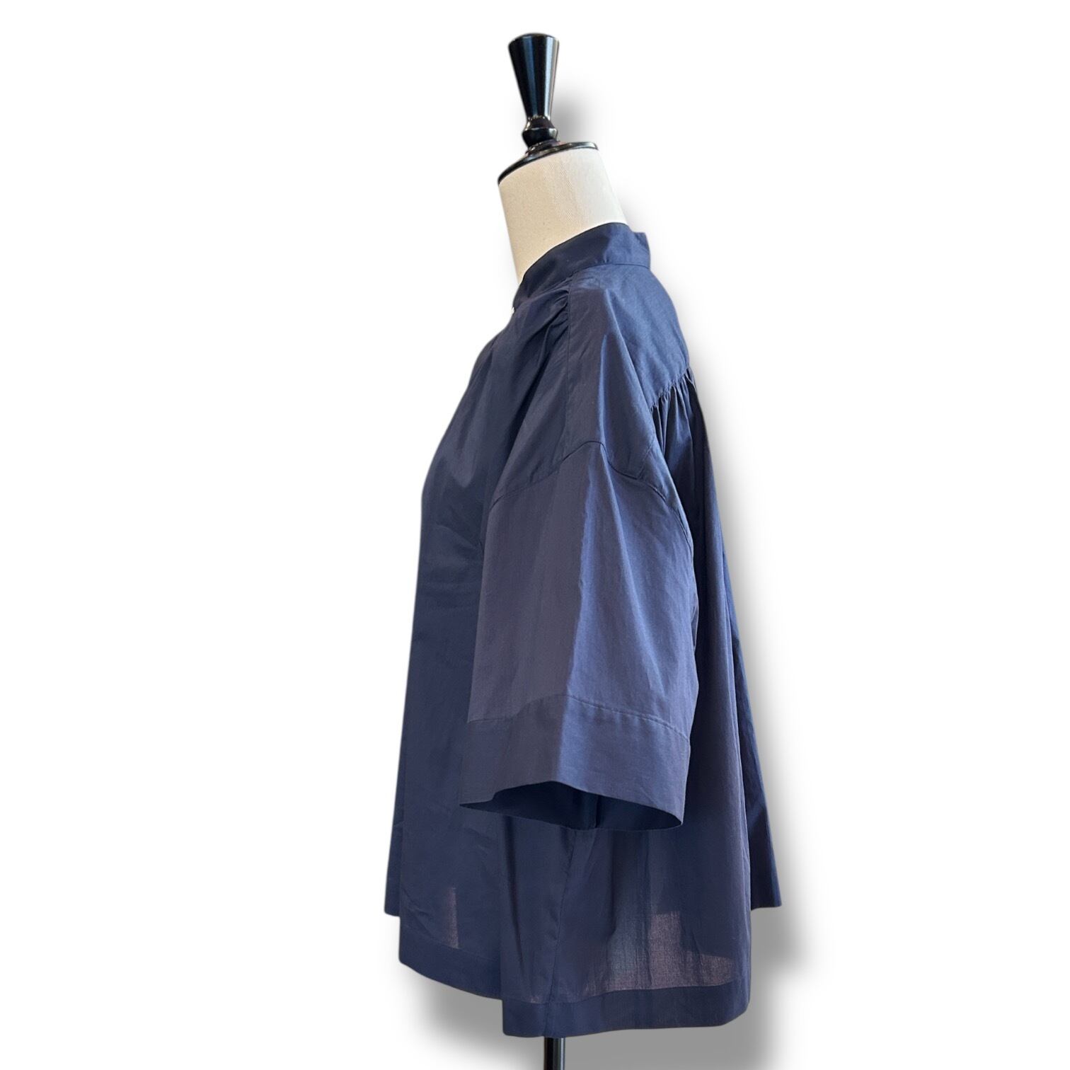 こちらのブラウスは、丸みのある優しいフォルムが特長で、きちんと感のある装いからカジュアルなスタイルまで活躍する万能アイテムです。ゆったりとした袖幅と身幅が作り出すリラックスした雰囲気は唯一無二。細番手の糸を甘めに織った英国リバティのコットンのローン素材は、抜群の着心地で通年使用できる優れものです。ふくらみのある柔らかな素材感が生み出す優しい雰囲気と、きれいな色目も魅力です。
