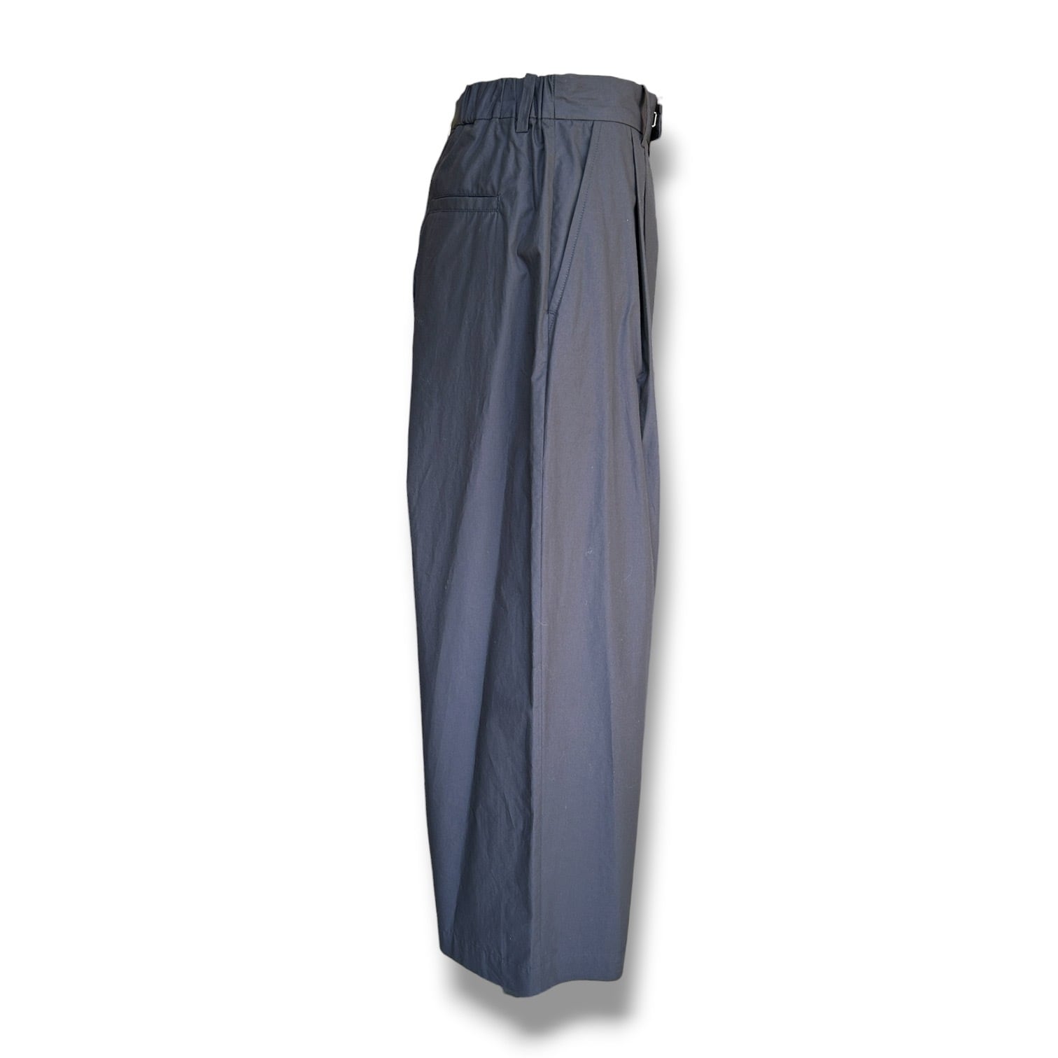 上質なコットンの糸を高密度に織り上げたハリのあるタイプライター素材を使用しているので、立体的なシルエットが際立つツータックワイドパンツ”ルイシャム”