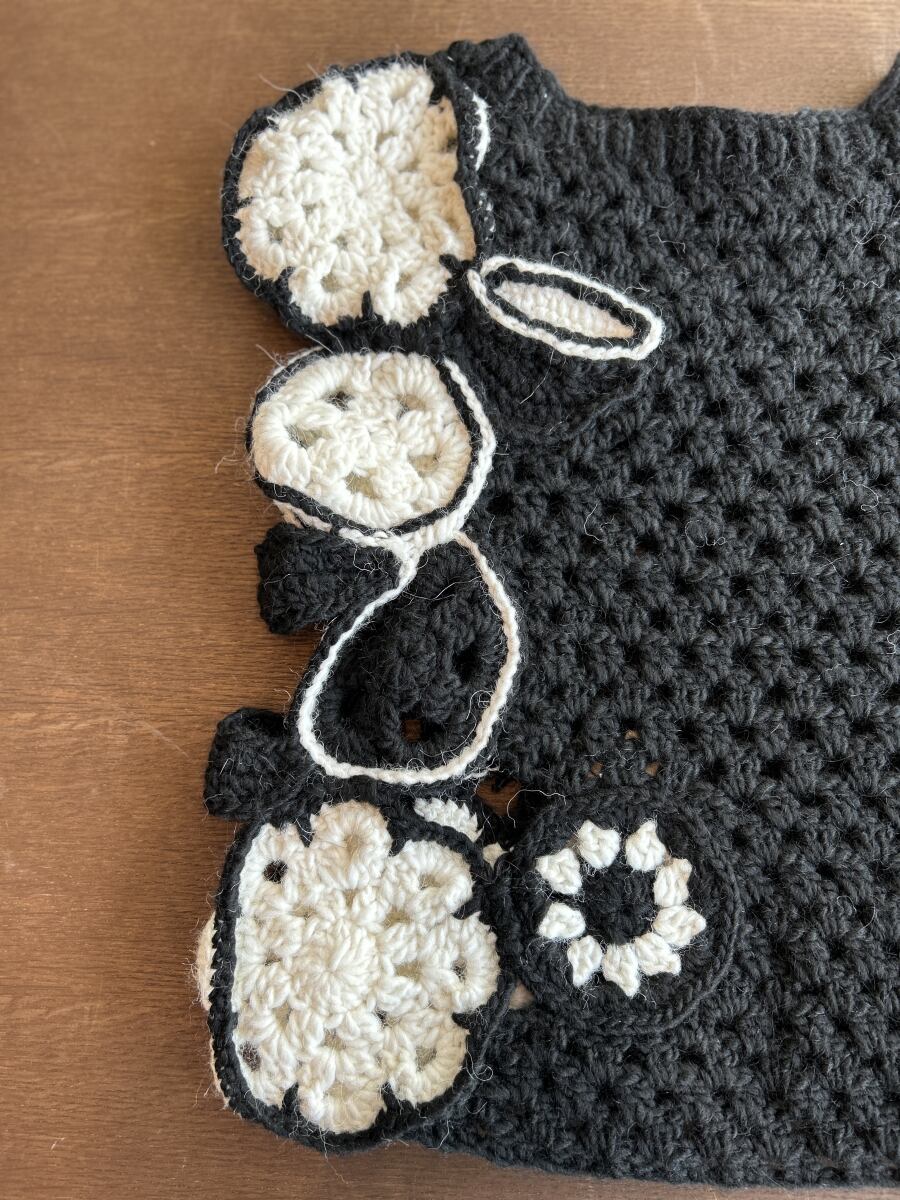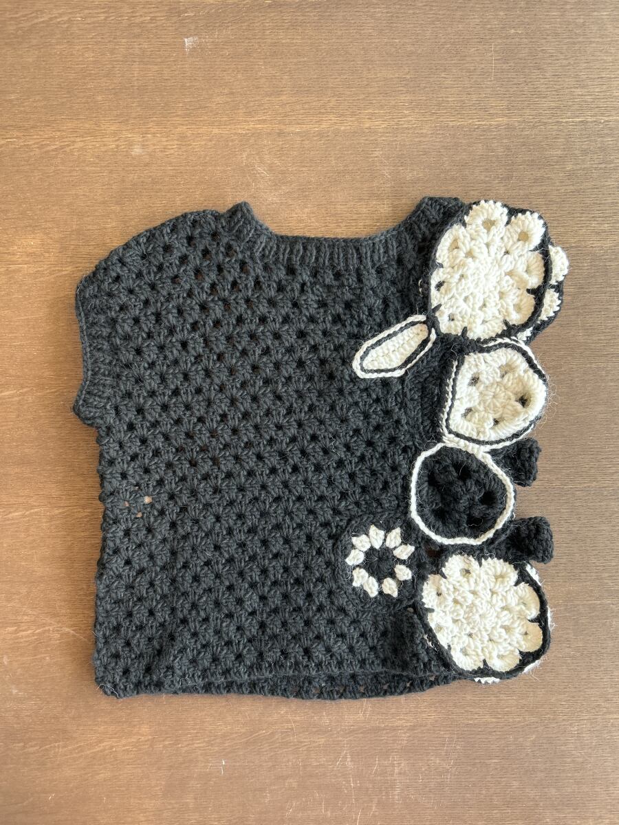 オフハンドメイドの優れたかぎ針編み技術を感じられる重ね着用のベスト。