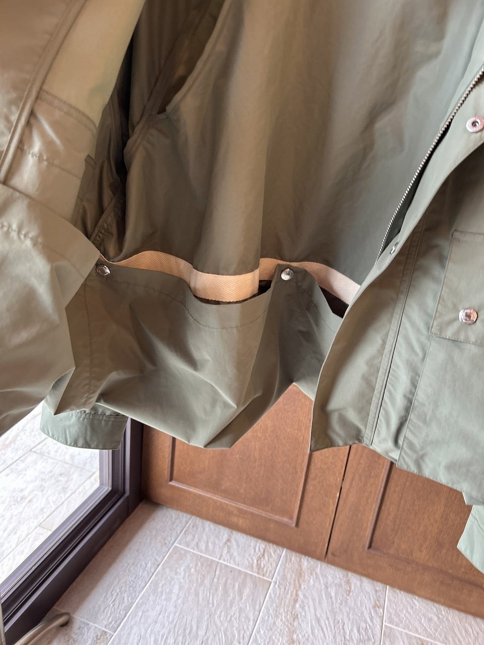 背中の大きなアンブレラヨークや、ラグランスリーブでボリュームのある袖が特長です。内側に折り返してスナップボタンを留めると着丈が約20cm短くなり、コーディネートのバランスを調節できます。撥水性もあり、レインコートとしても活躍します。