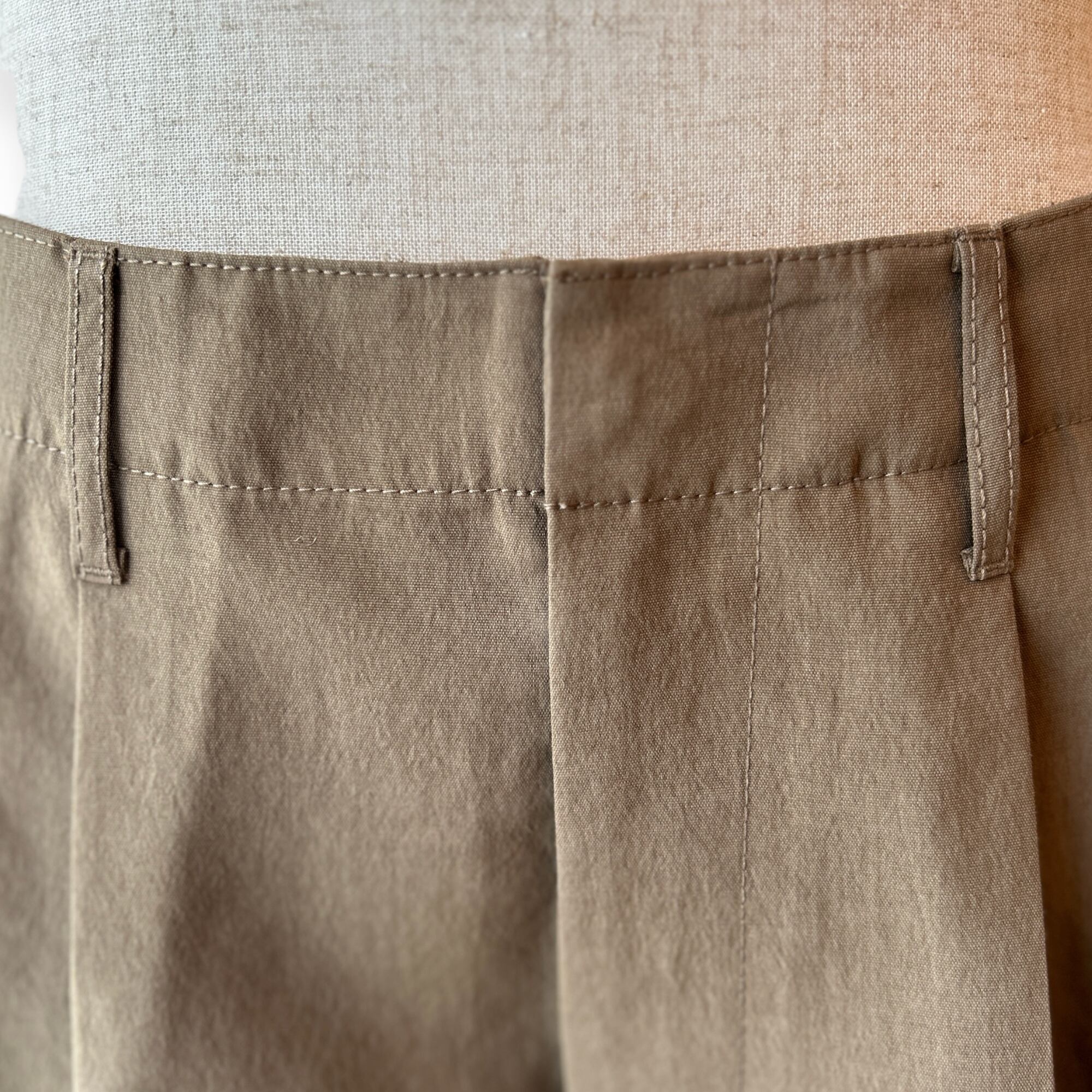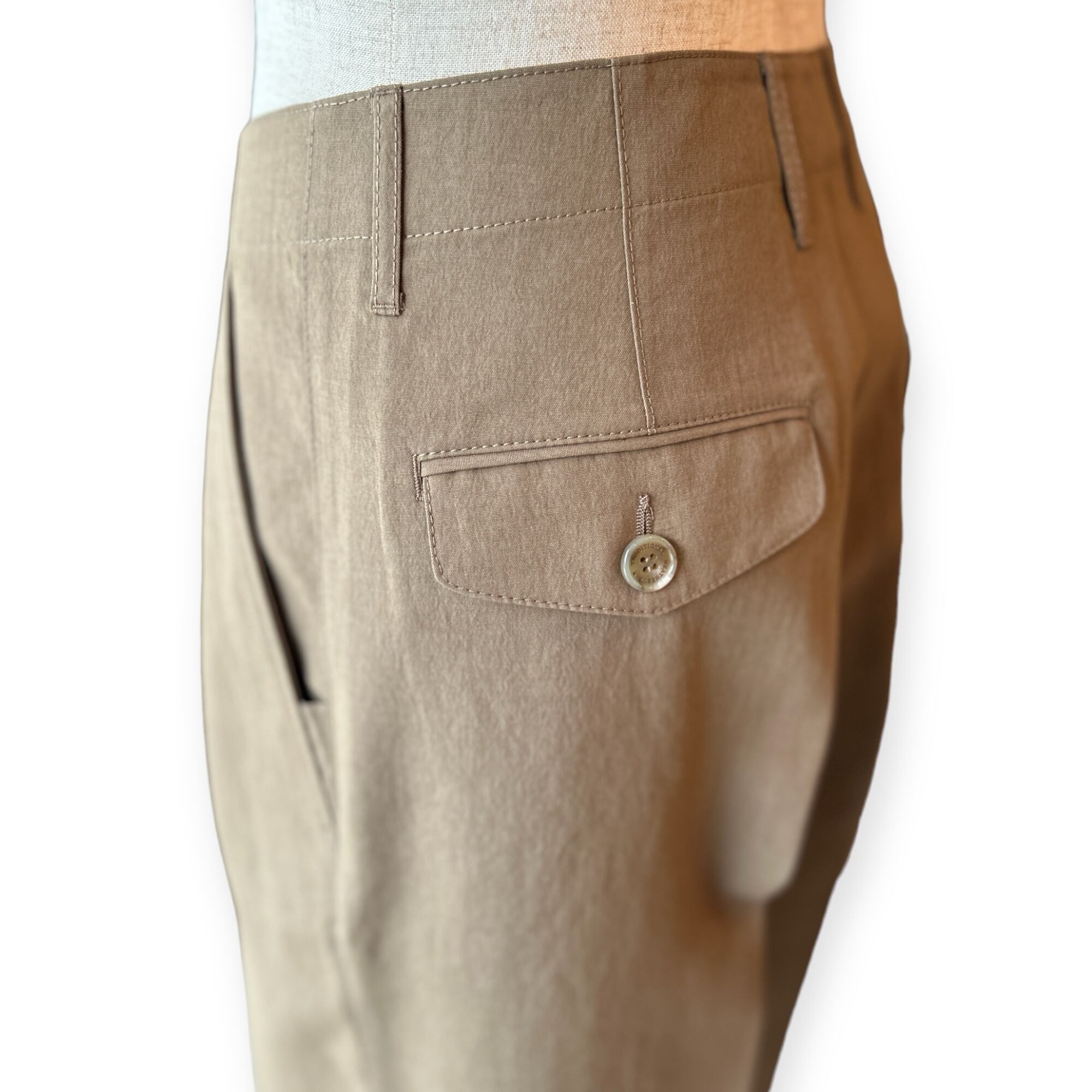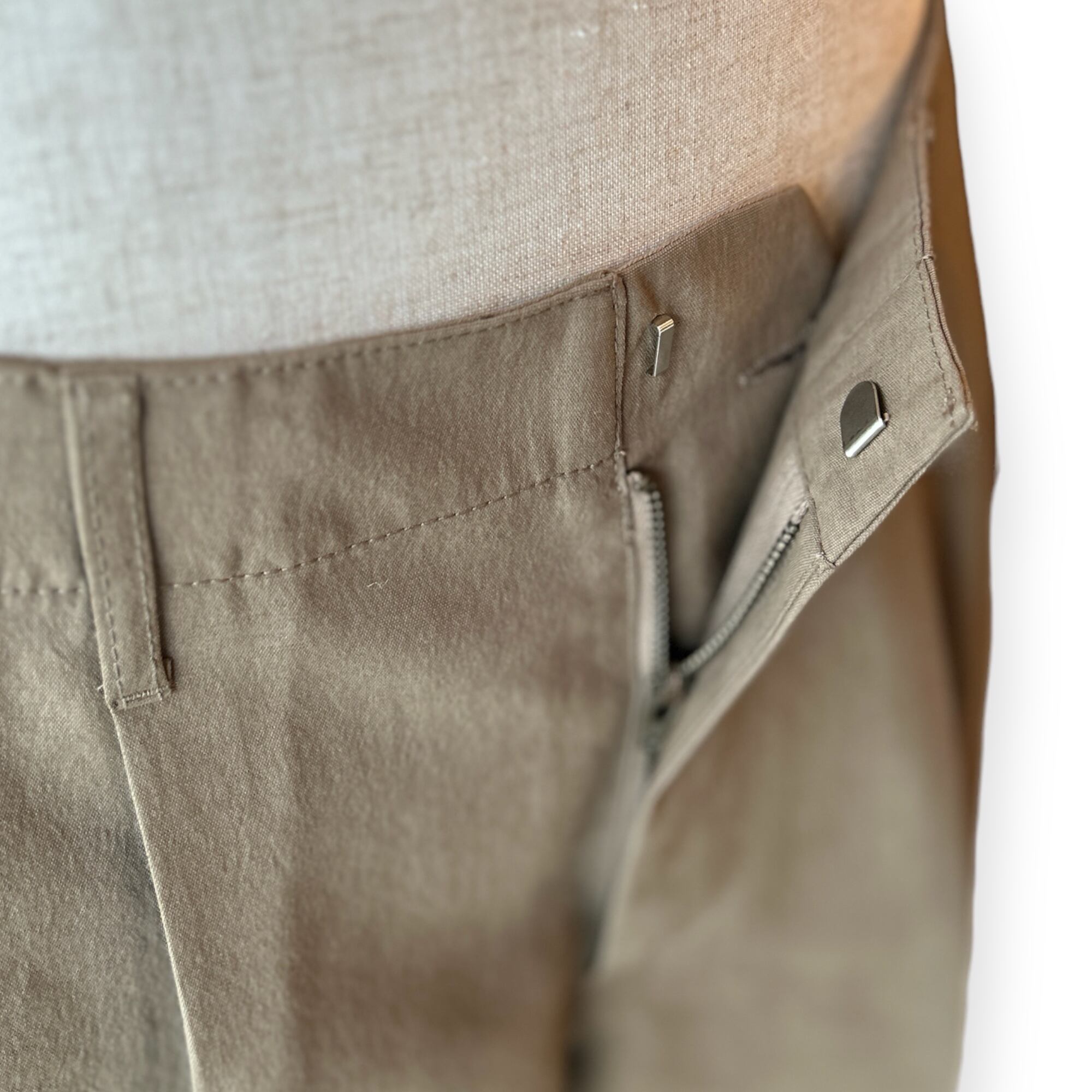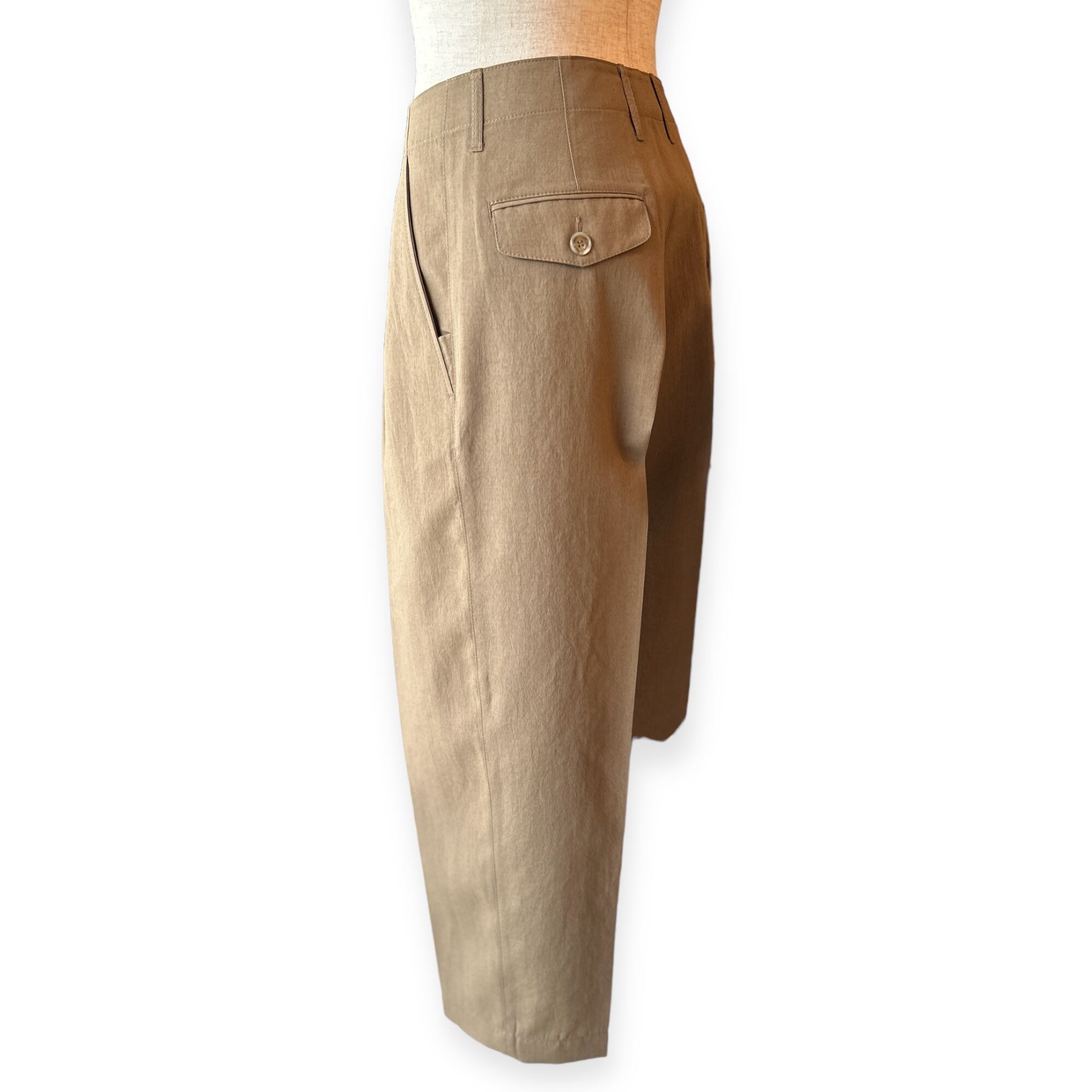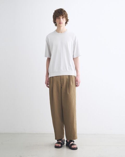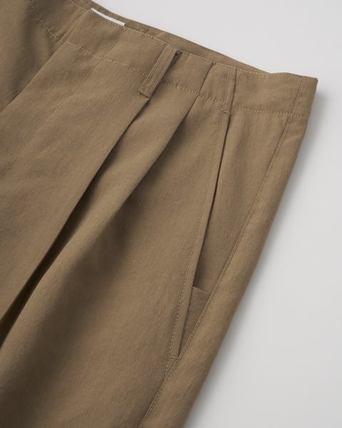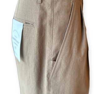 フロントボタンが表に出ない仕様なので、ベルトレスで着用した際のキマりが抜群です。中が空洞のポリエステルの糸(中空糸)で丁寧に織られたPY素材製なので、きめ細やかで少し光沢のあるリュクスなムードがあって、さらさらした手触りで驚くほどの軽さが魅力です。