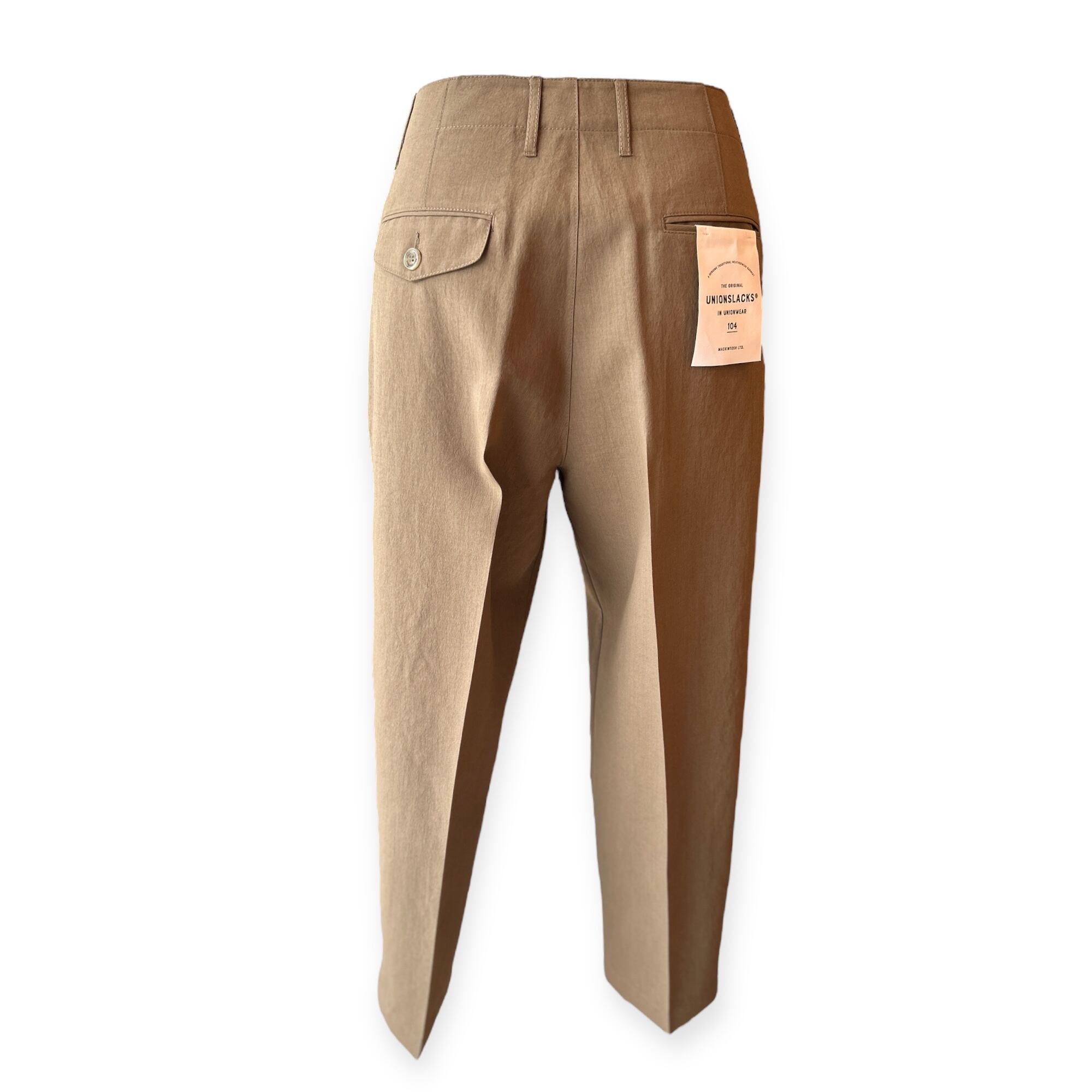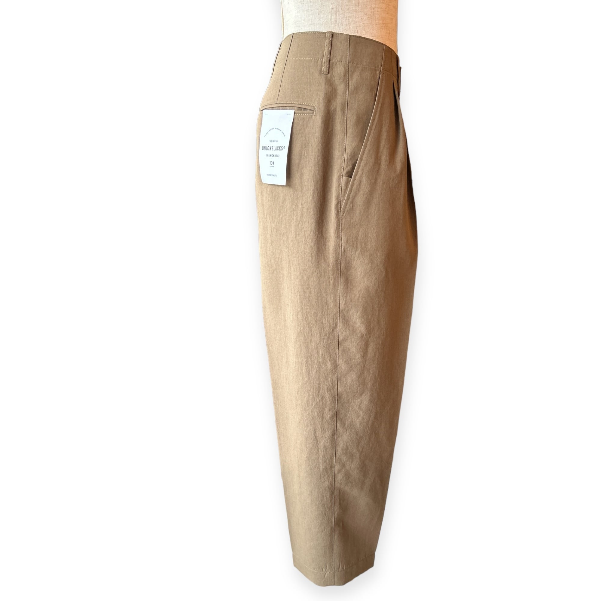 こちらの大人気のユニオンスラック104は、フロントに浅い2タックを配し、腰回りがゆったりしながらもヒップ下から裾にかけて穏やかにテーパードしたすっきりとした美しいラインが魅力です。