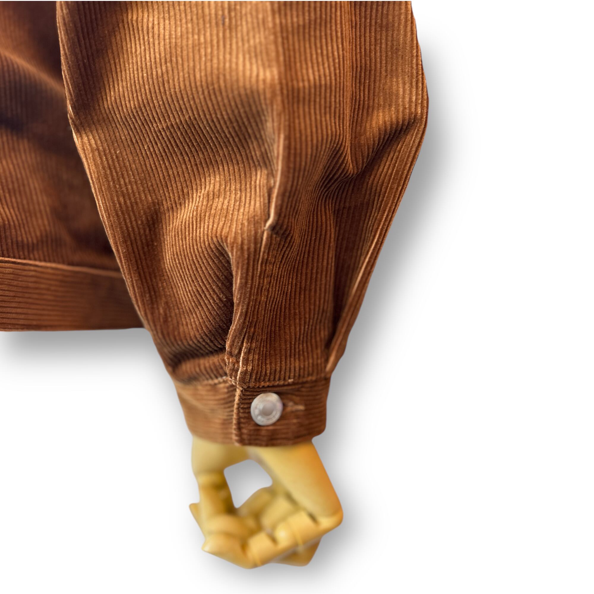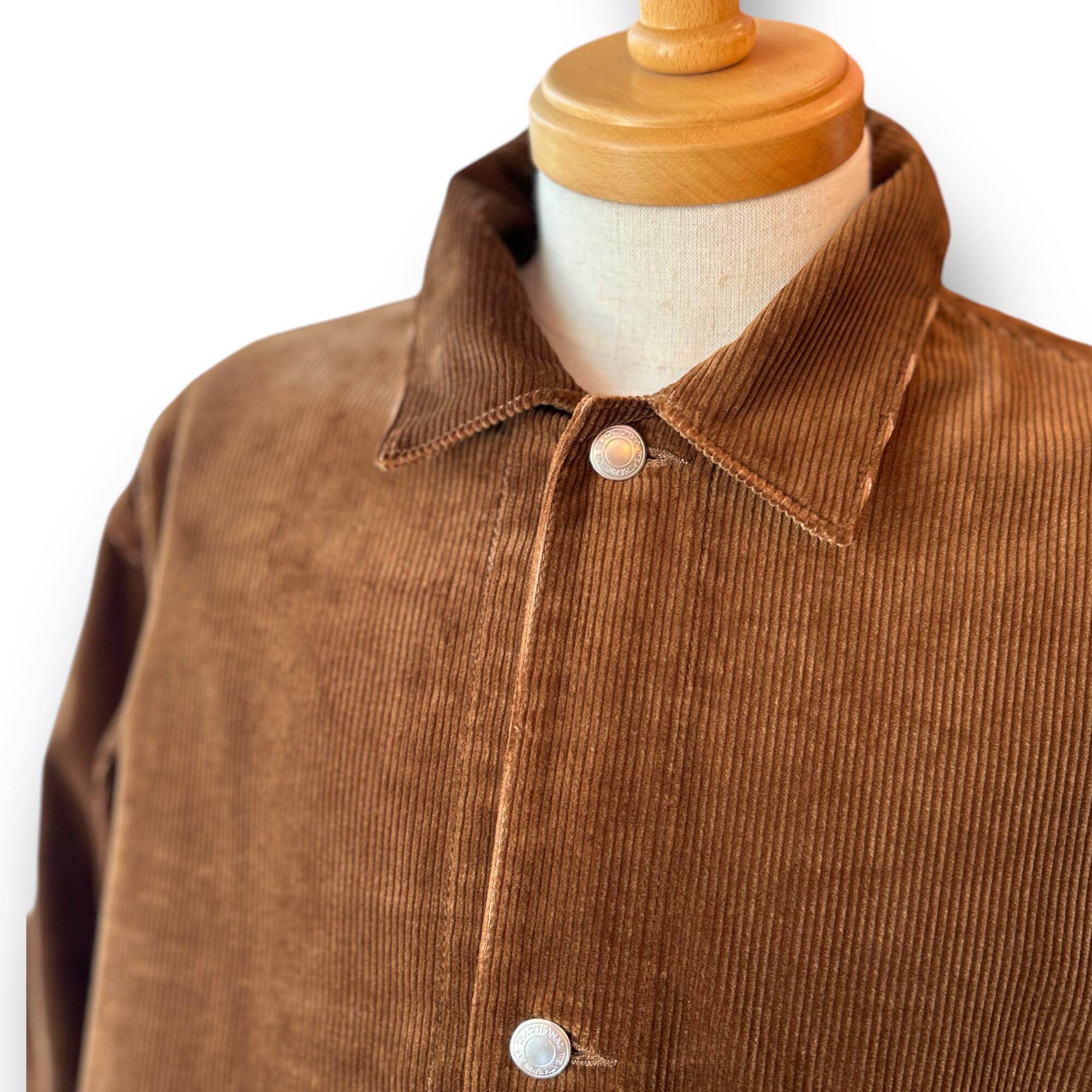 こちらのワークジャケット001は、ゆったりとした身幅とショート丈から生まれる着やすくもすっきりとしたシルエットが魅力です。フロントのシルバーに輝く4つのタックボタンや、コッパーリベットで補強されたスクエアポケットを一つだけ配していることなど、無駄なディテールを排したデザインなので着る人を選びません。こちらの太畝のコーデュロイ素材は程よいハリが特徴で、立体的な美しいシルエットが際立ちます。