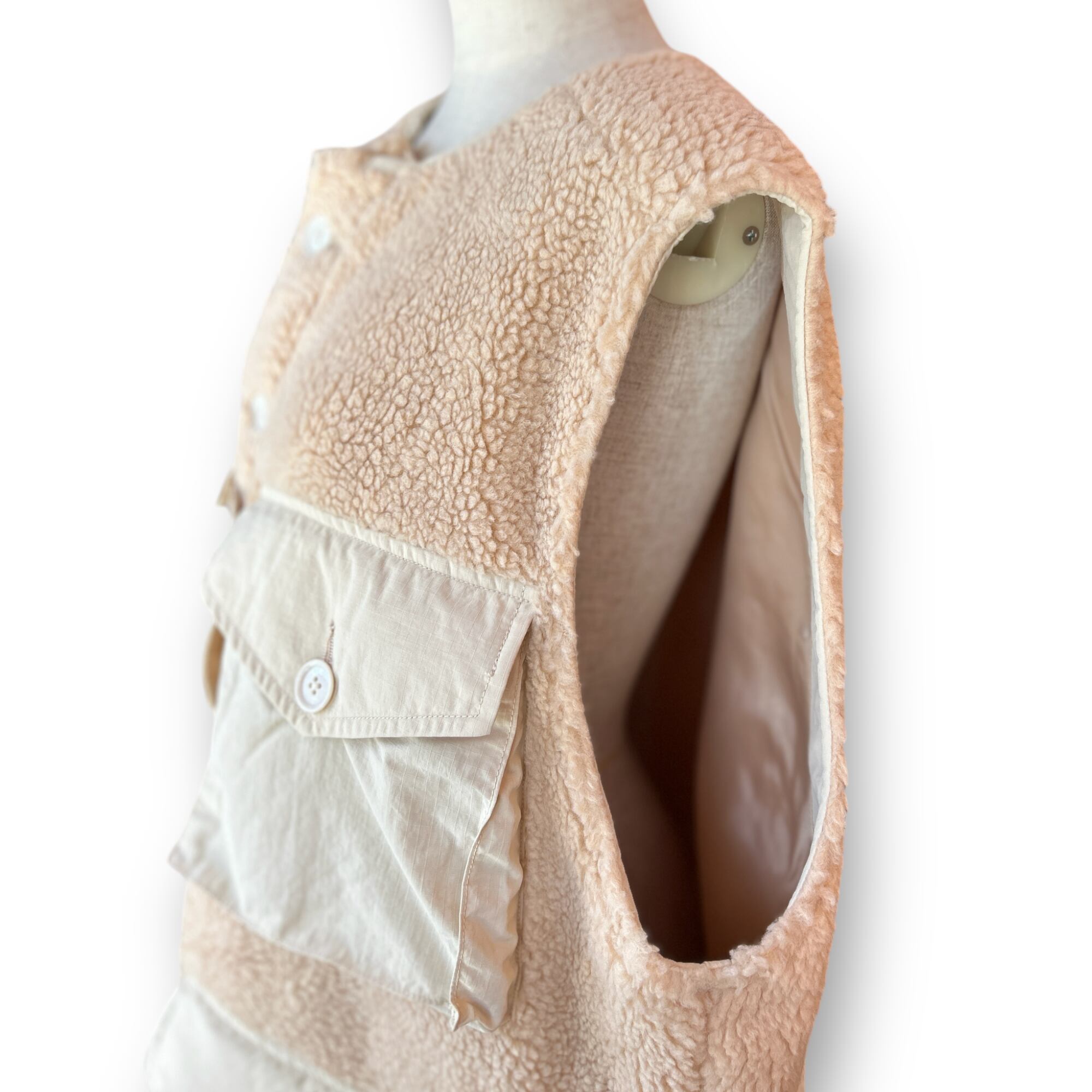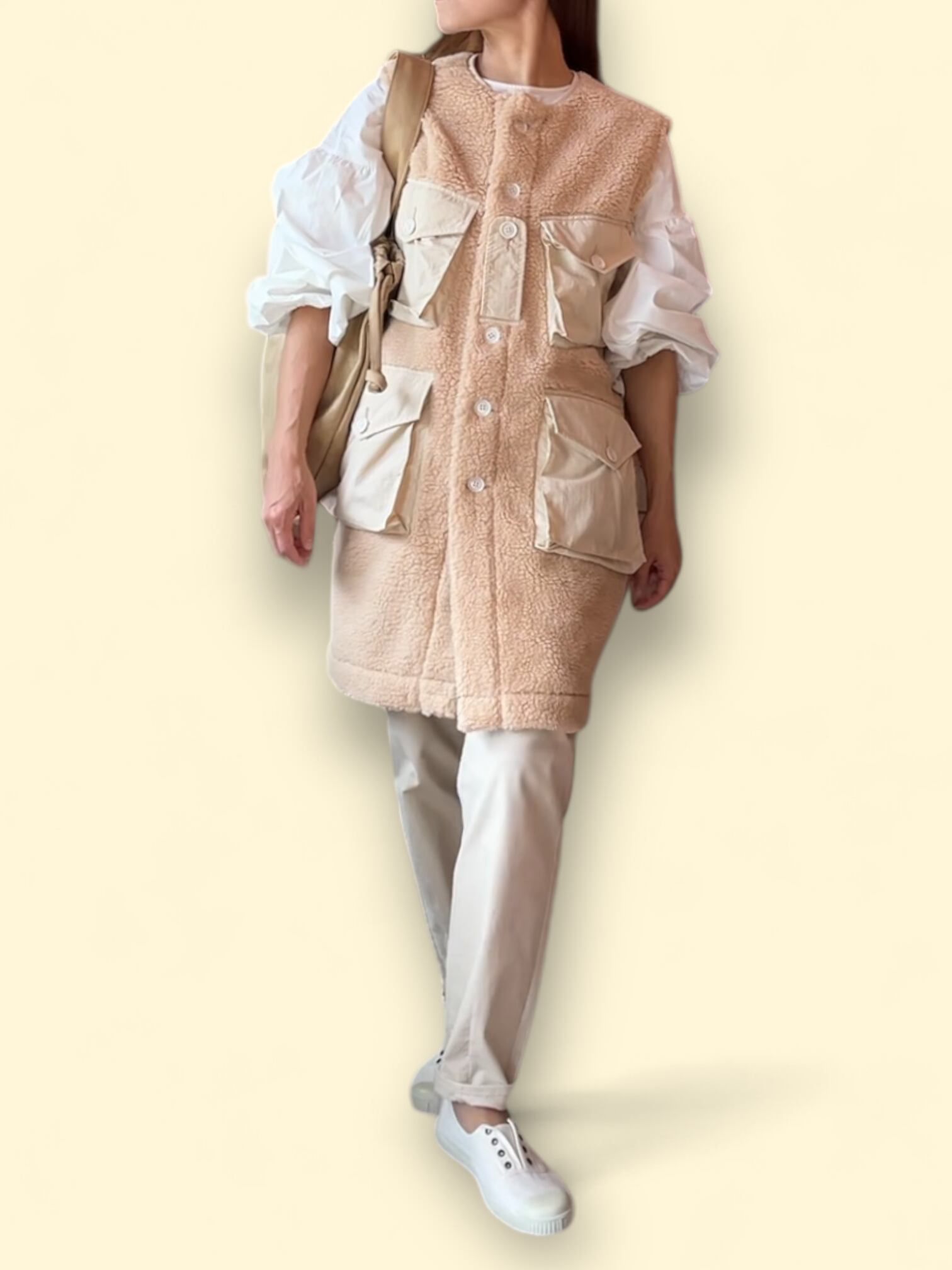従来の綿とポリエステル生地からもこもこなボアフリースに置き換え裏地付きのロングベストへとブラッシュアップされています。