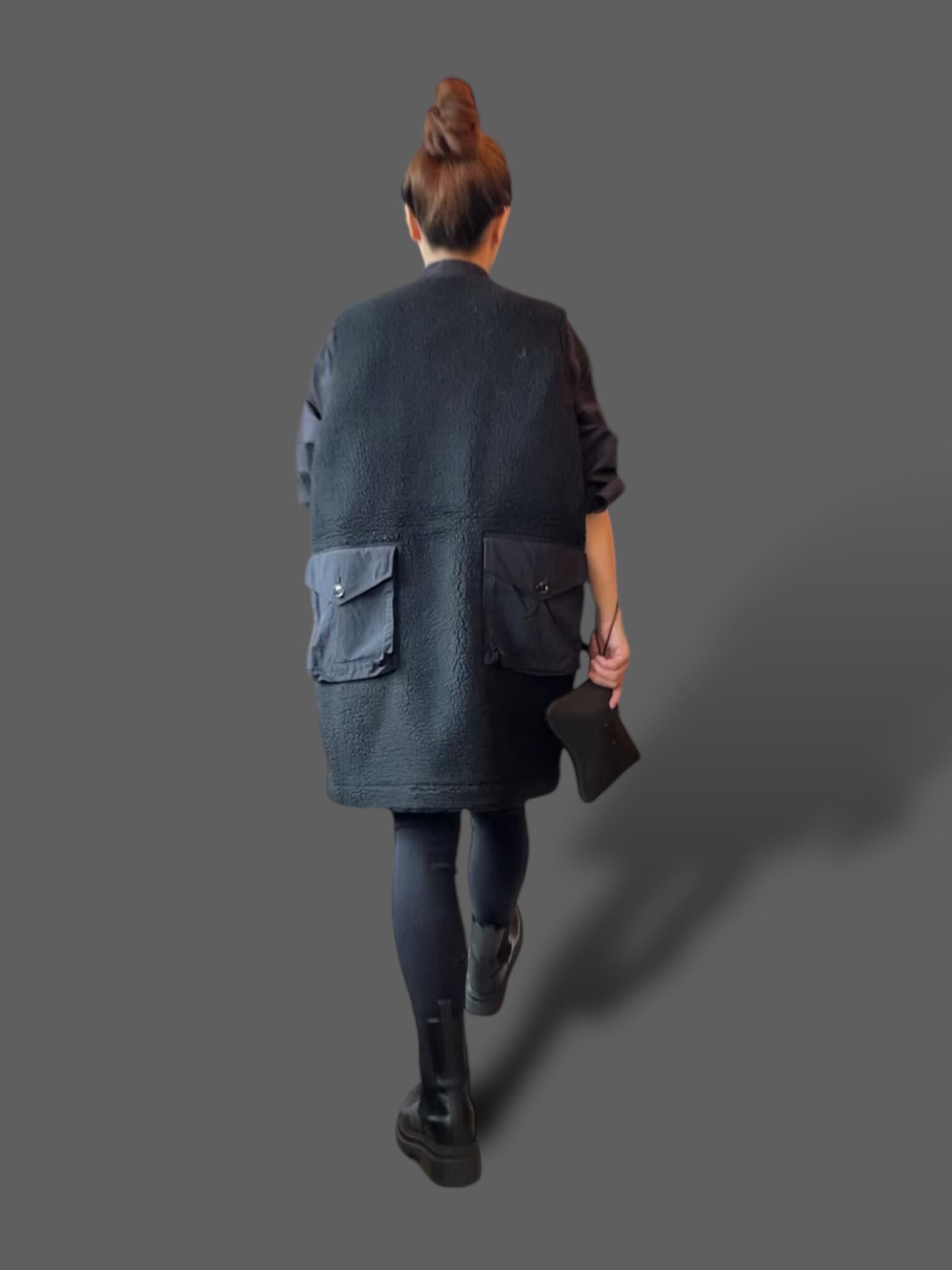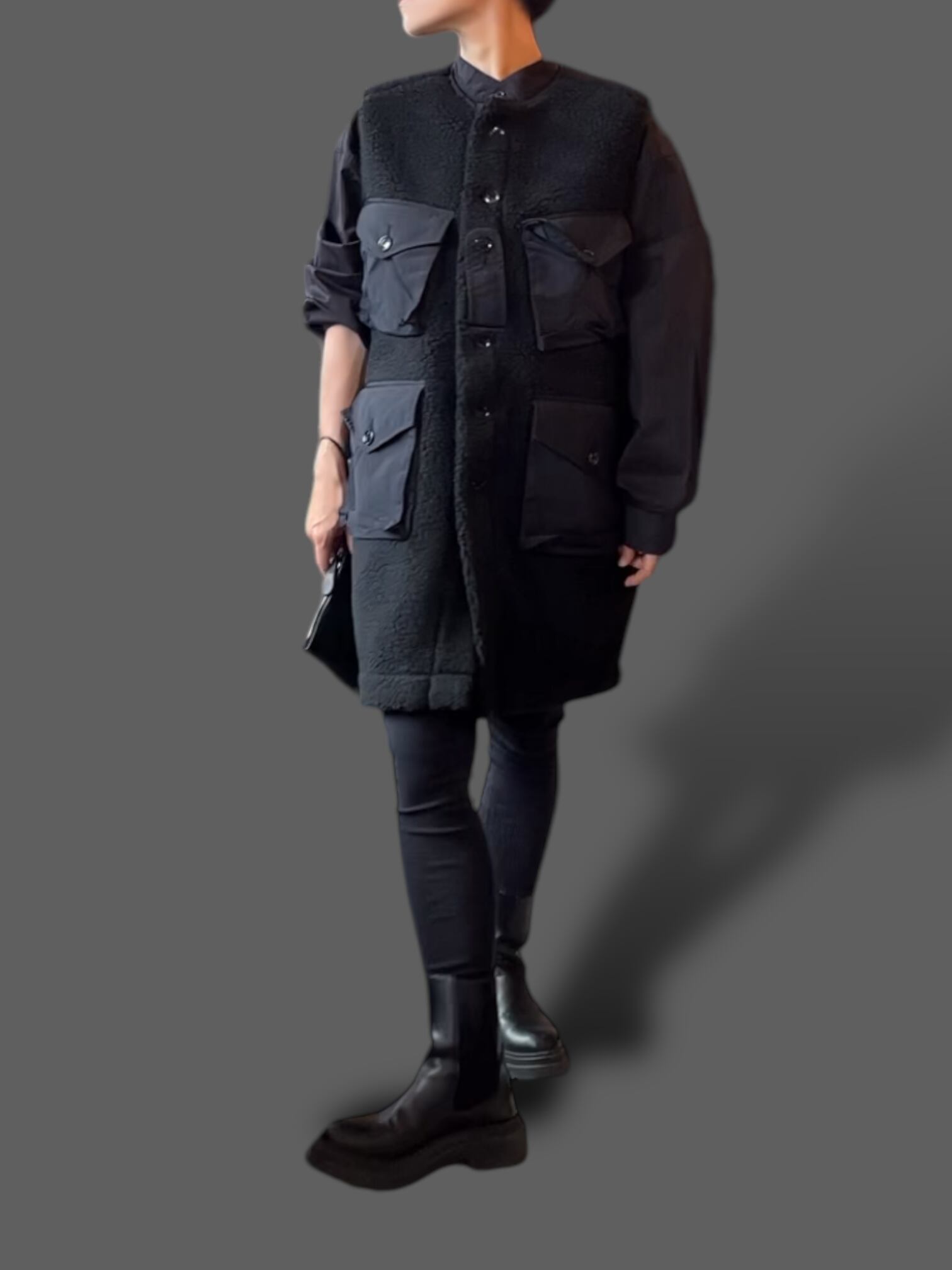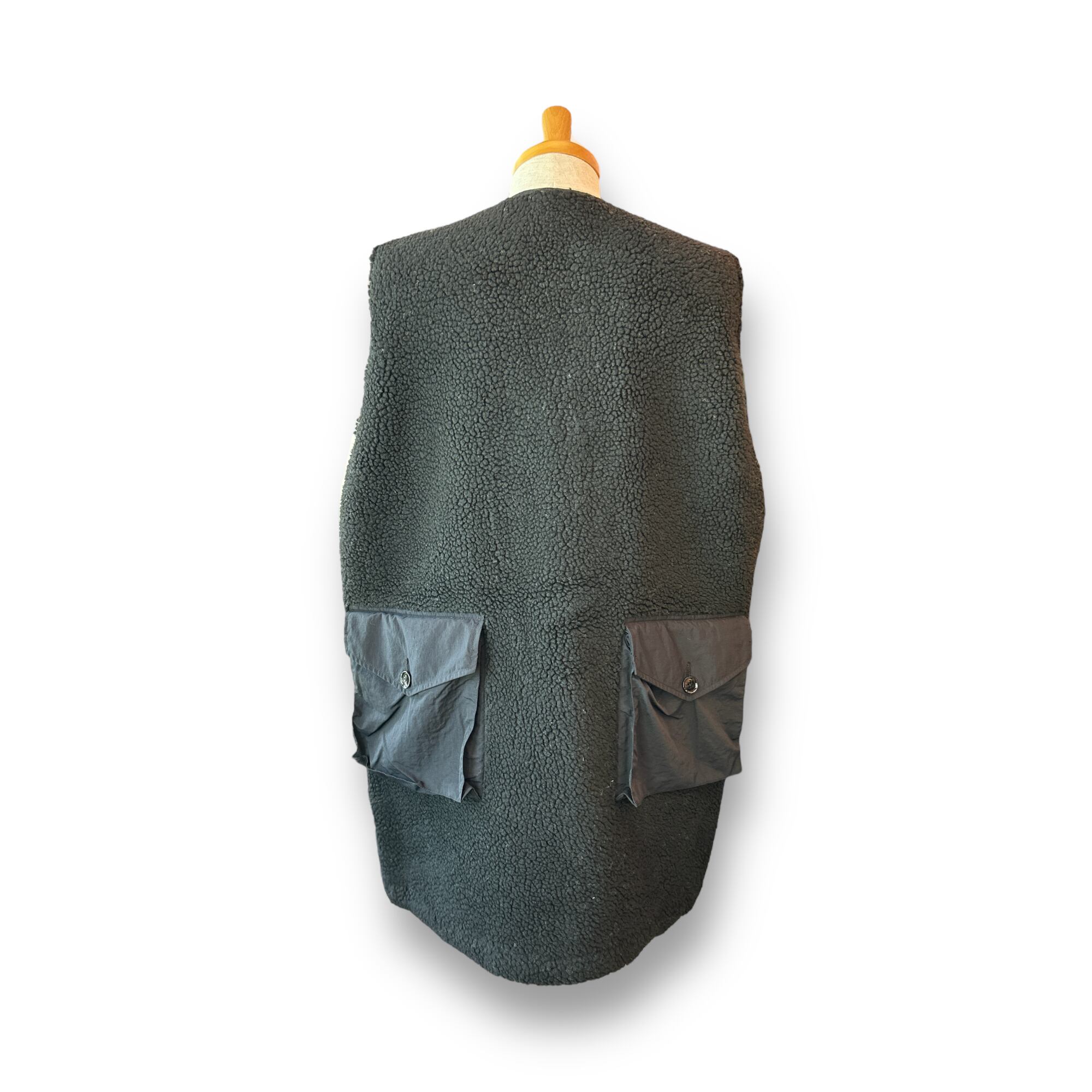 従来の綿とポリエステル生地からもこもこなボアフリースに置き換え裏地付きのロングベストへとブラッシュアップされています。