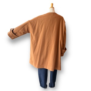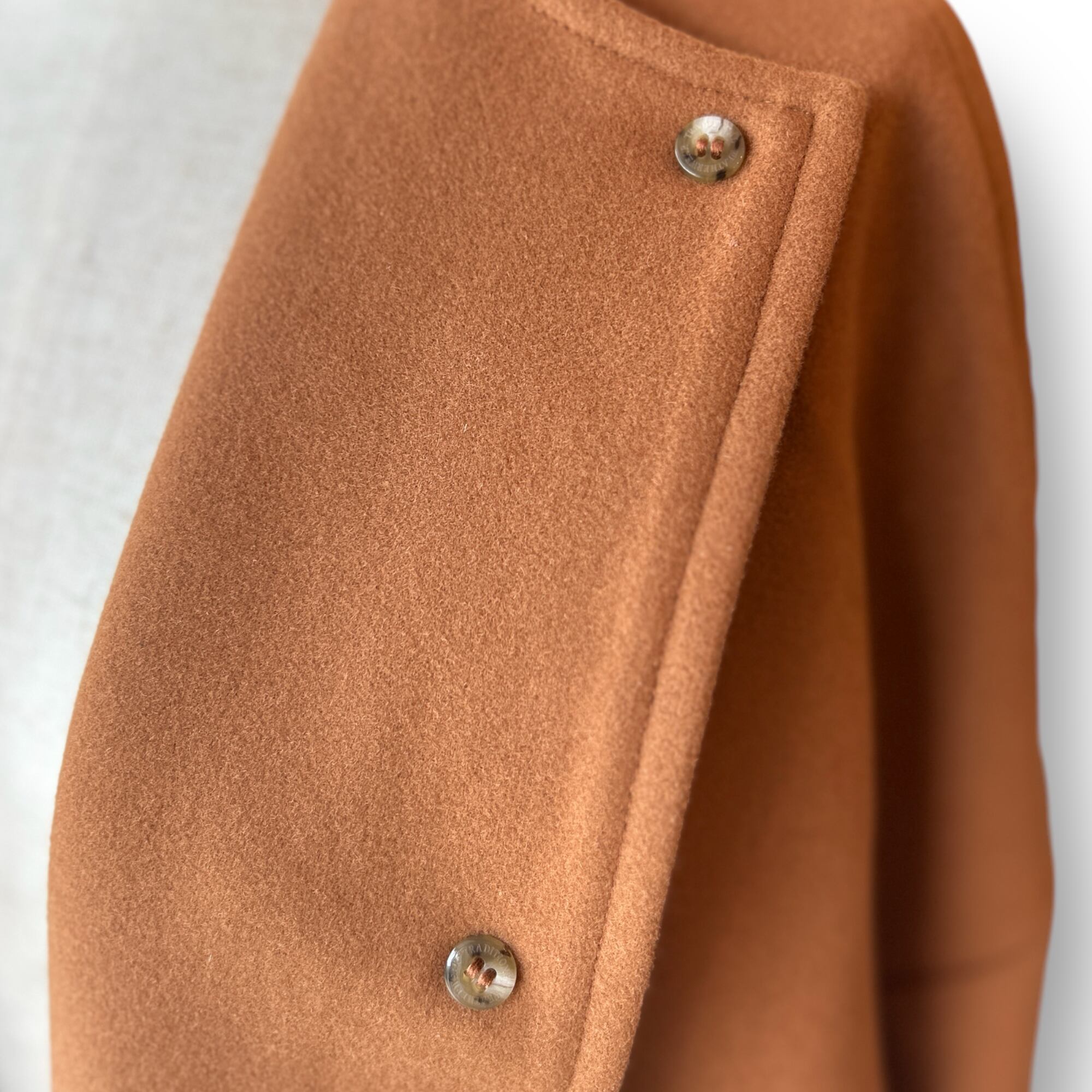 今シーズン、マールトン ノーカラーは3つの素材でリリースされ、こちらは程よいハリと膨らみが特長のメルトン製なので、立体的なシルエットが際立ちます。ブラウンオーカーとボトルグリーンは、24年秋冬シーズンの新色で、COCOON PLUSではこの新色のみの展開となります。