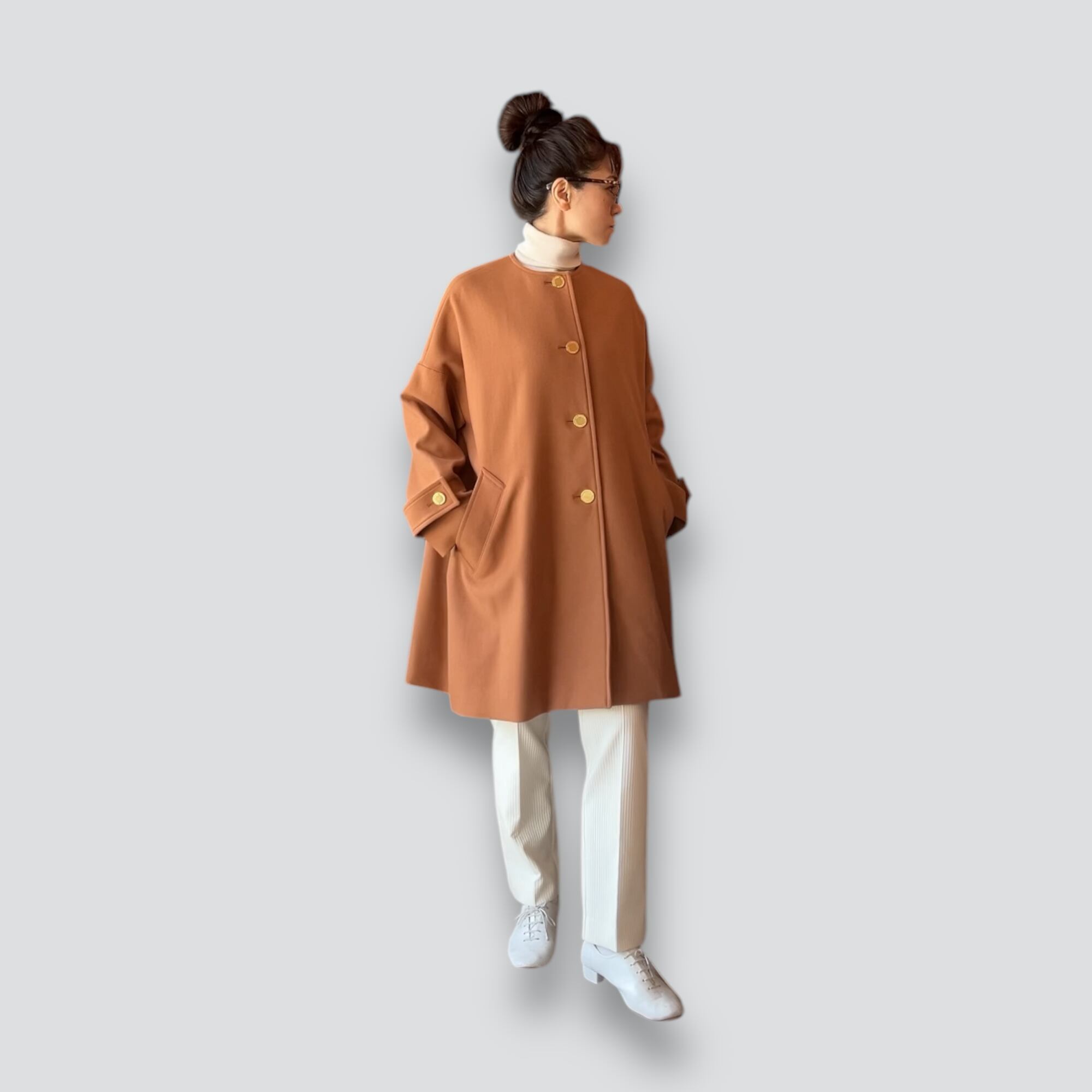 きちんと感がありながら、ゆったりとした優しいシルエットが魅力で、リュクスなドレス感のある装いから、カジュアルなデニムスタイルまで活躍する着る人を選ばない万能コートです。フラットなゴールドに輝くボタンが、きりりと全体の印象を引き締めます。