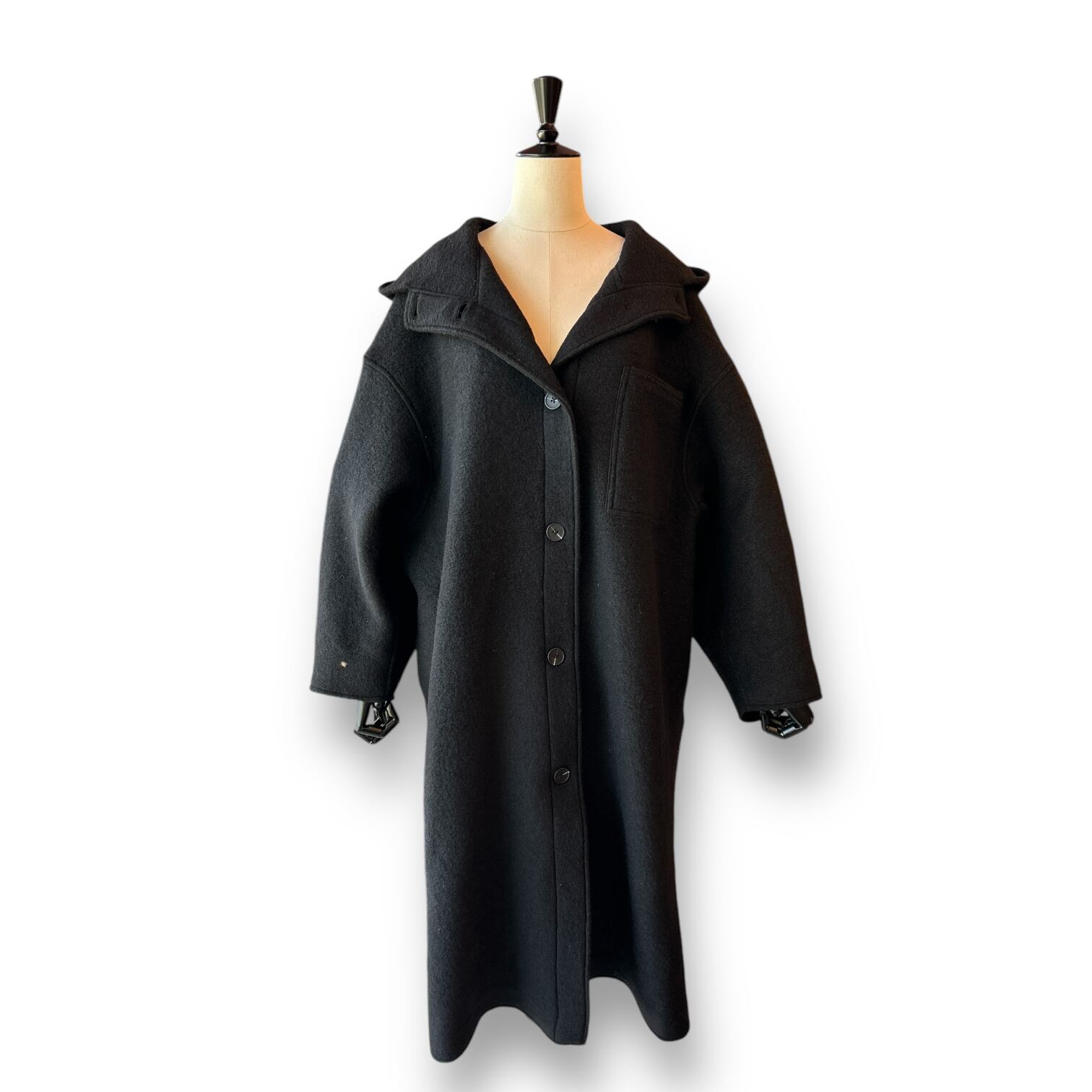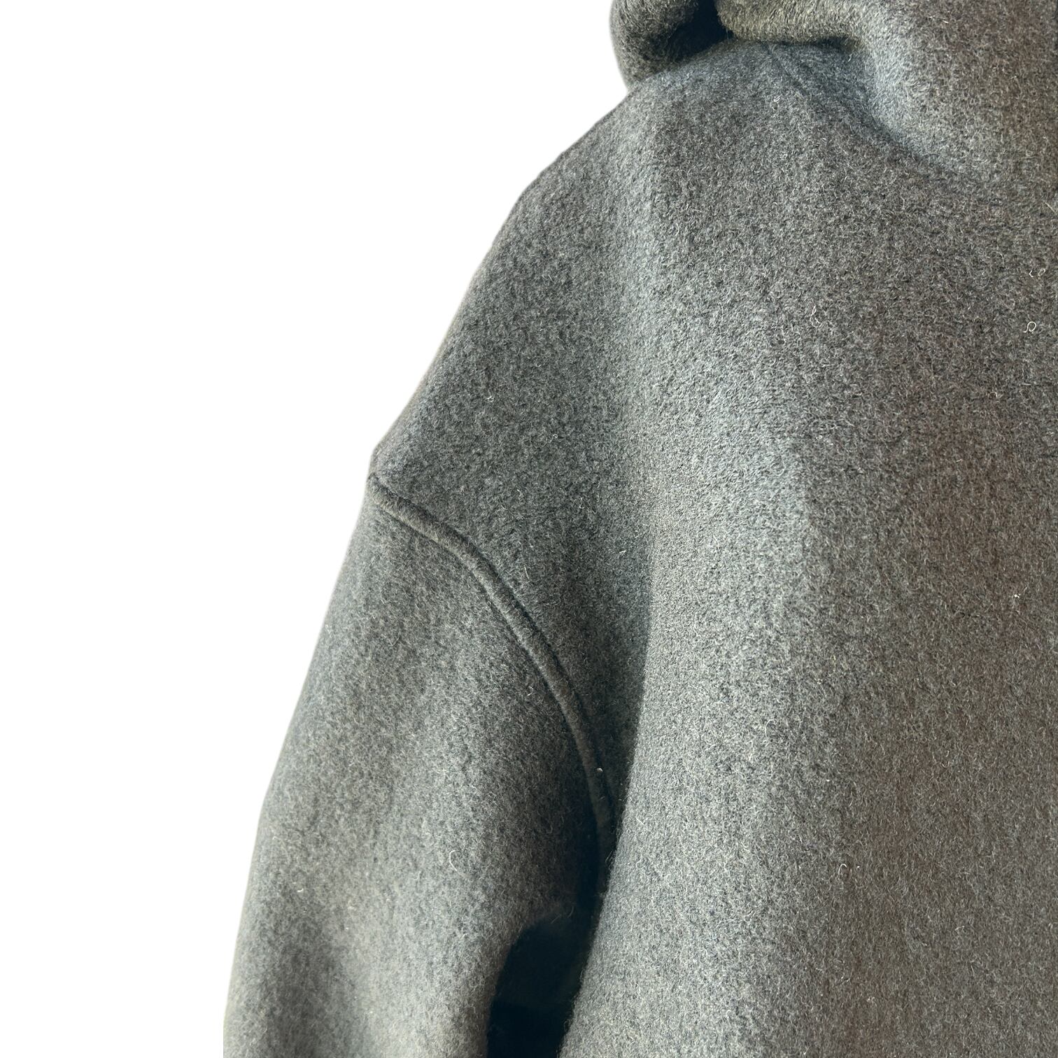 フードが立体的になるスタンドカラーと、柔らかく丸みのあるコクーンシルエットが