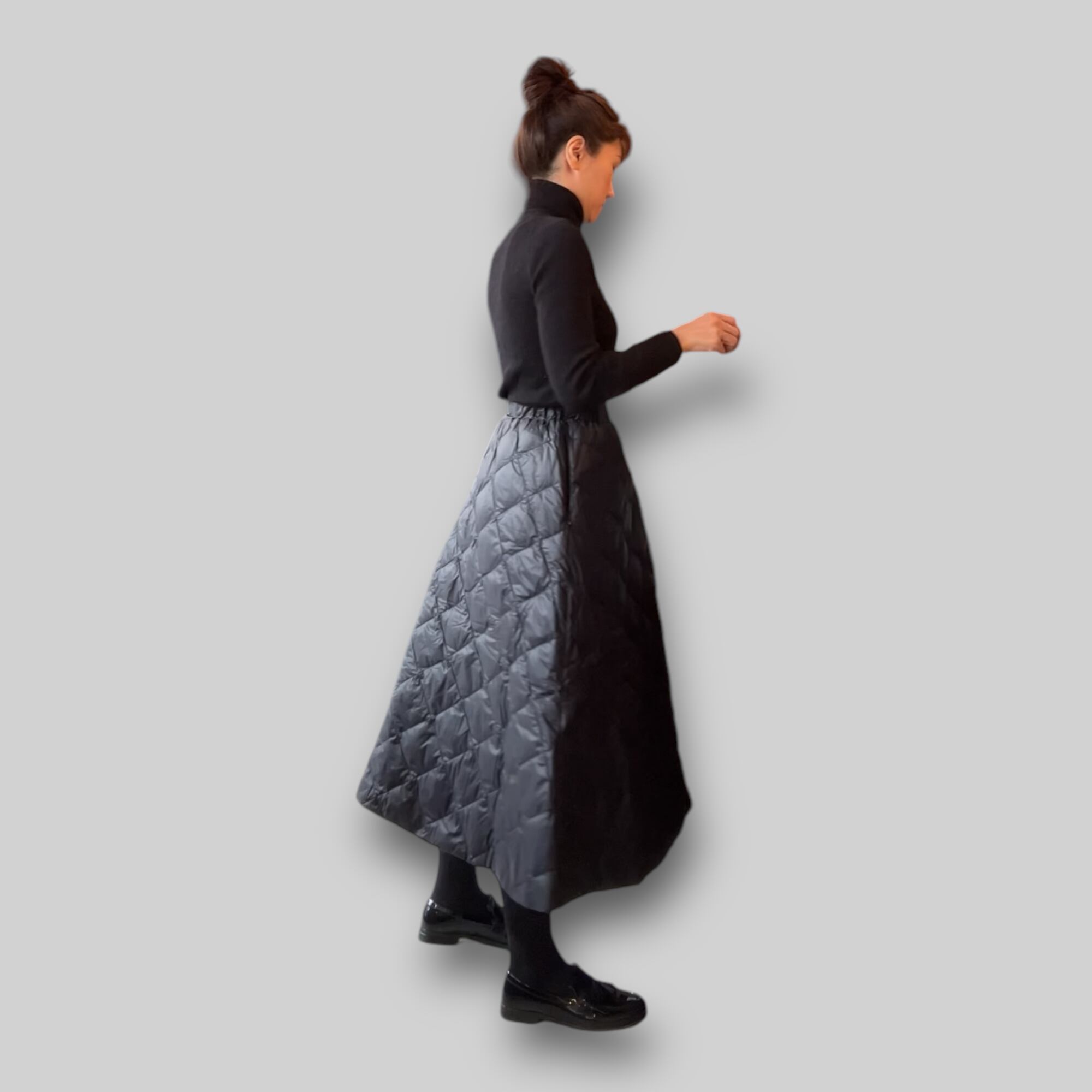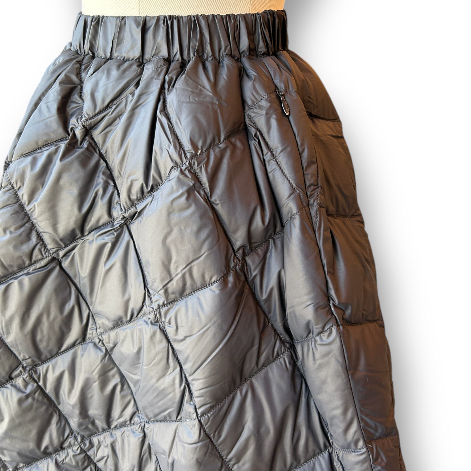 スカート単体着用はもちろん、防寒にパンツの上から重ね着もできるダウンスカートです。